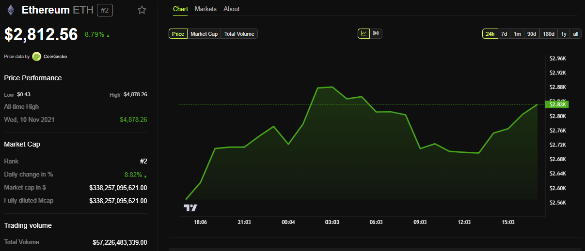 BeInCrypton tiedot osoittavat, että ETH:n kauppahinta oli 2 812 dollaria, nousua lähes 9 % tiistain istunnon avauduttua.