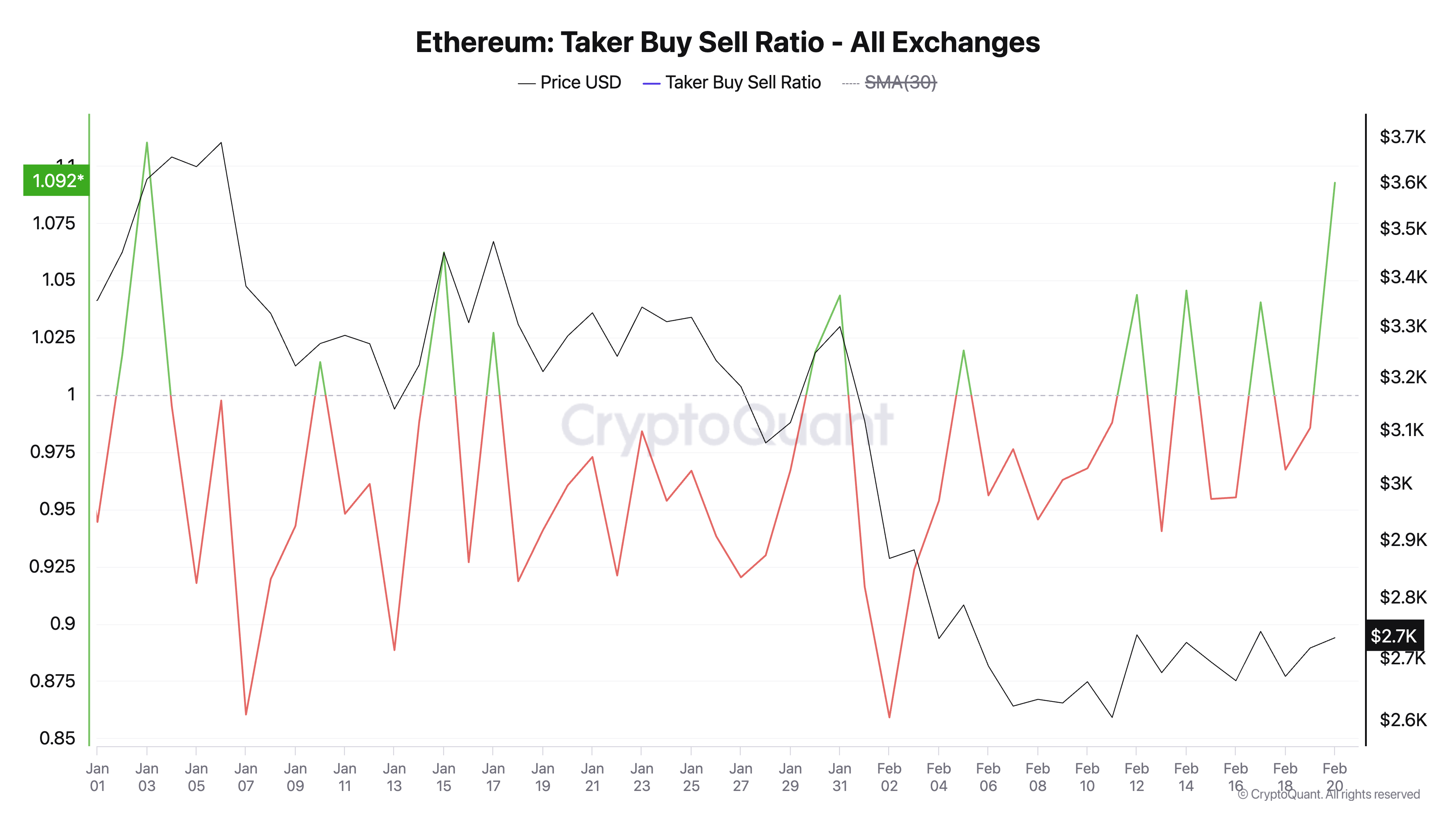 Tärkeä indikaattori tästä nousujohteisesta tunnelmasta on Ethereumin Taker-Buy-Sell Ratio, joka on noussut korkeimmalle tasolleen sitten tammikuun alun. CryptoQuantin mukaan se on tällä hetkellä 1,09.