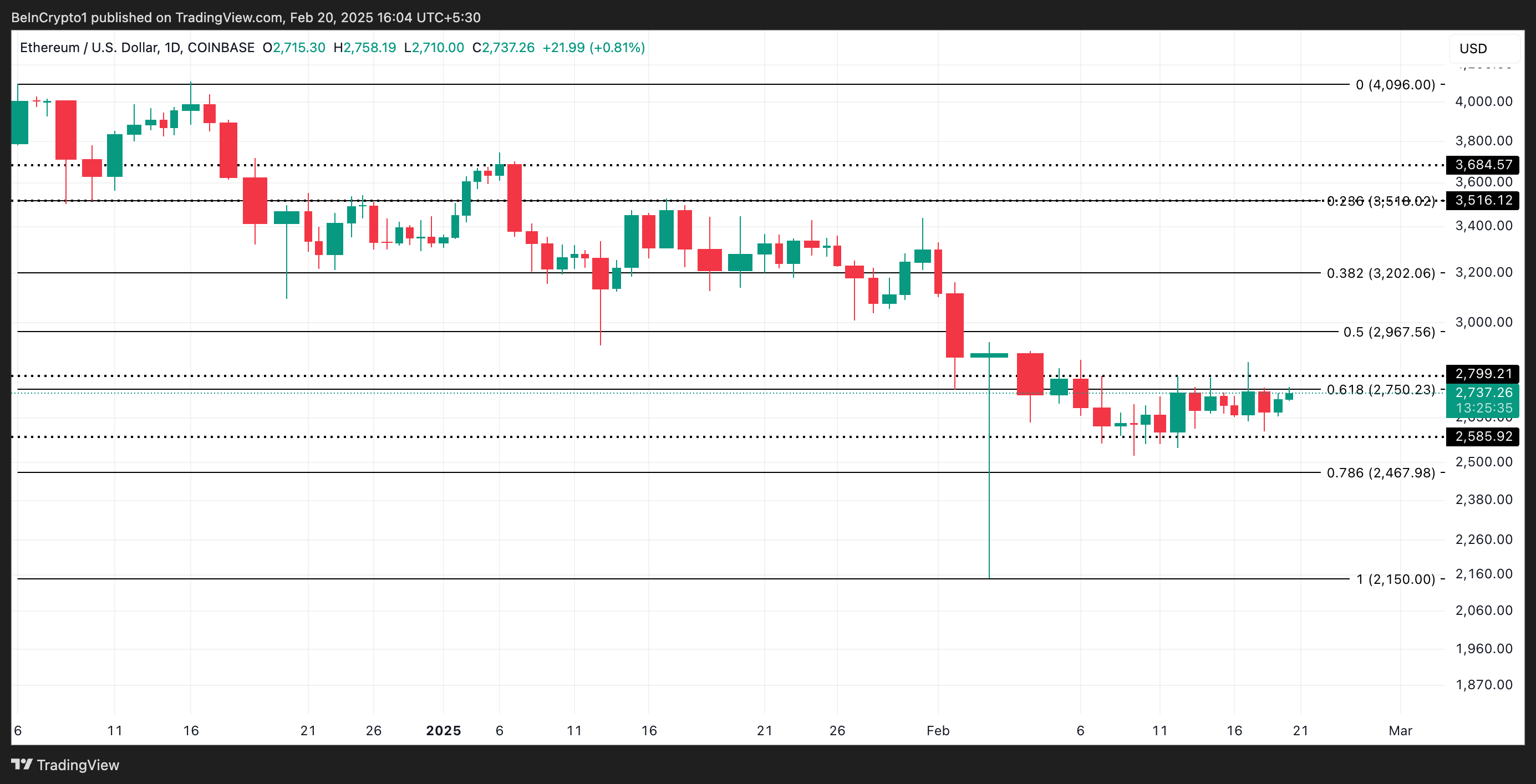 Ethereum (ETH) on käynyt kauppaa kapealla alueella helmikuun alusta lähtien, vaihdellen keskeisten tukitasojen ja vastustasojen välillä.