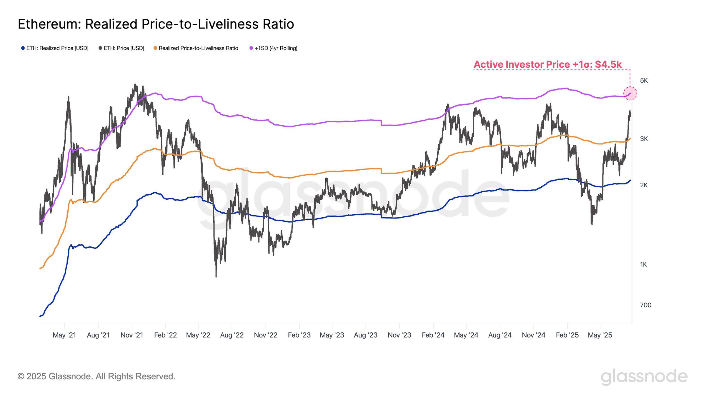 Ethereumin Realized Price to Liveliness -suhde osoittaa merkittävää kynnysarvoa nykyiselle hintarallille. Suhde osoittaa, että nykyinen nousun vastus Ethereumille on 4 500 dollaria, taso, joka on toiminut merkittävänä esteenä aiemmissa markkinasykleissä. Erityisesti tämä hintapiste toimi vastuksena maaliskuussa 2024 ja 2020–2021 markkinasyklin aikana.