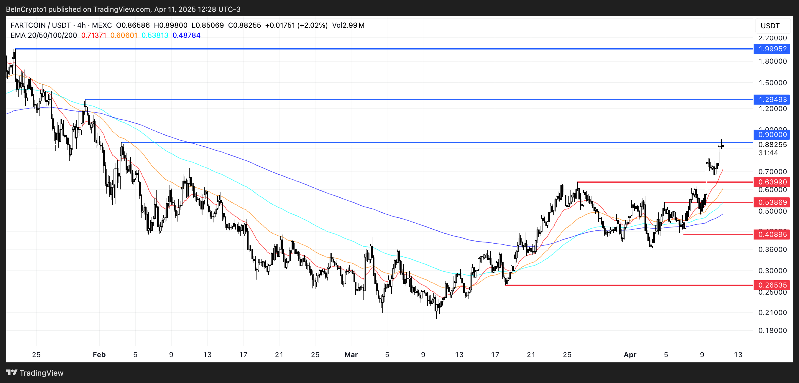 FARTCOINin hintakaavio näyttää tällä hetkellä nousujohteista EMA-rakennetta, jossa lyhyen aikavälin liukuvat keskiarvot ovat pitkän aikavälin yläpuolella—osoittaen, että tunnelma pysyy härkien eduksi.
