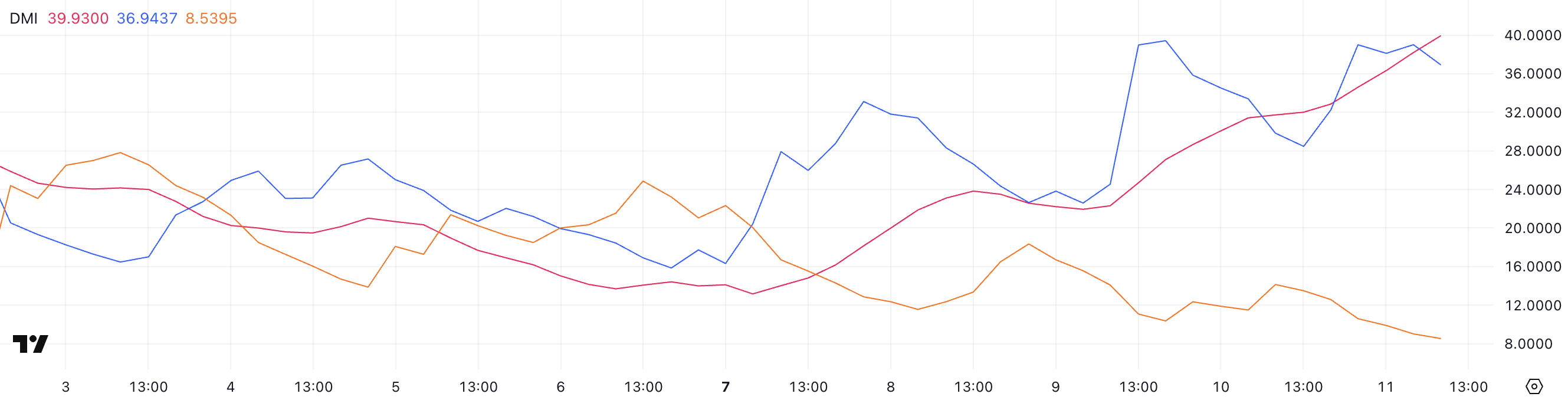 FARTCOINin DMI-kaavio osoittaa vahvaa trendin voimistumista, kun ADX on noussut 22,3:sta 39,93:een viimeisten kahden päivän aikana.