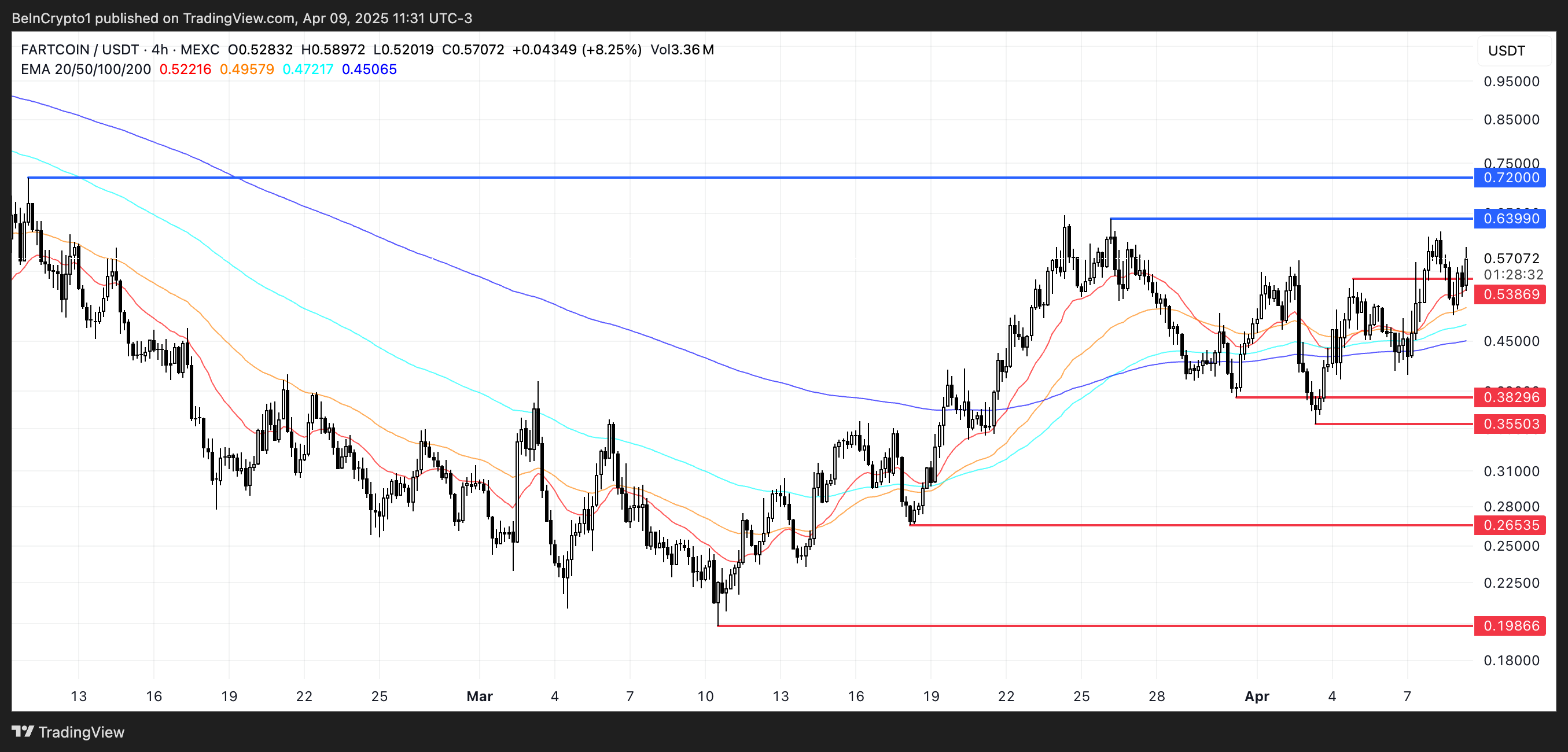 FARTCOINin hinta on tällä hetkellä nousutrendissä, ja jos härkämarkkinan tunnelma säilyy, se voi pian testata vastustusta 0,75 dollarissa.