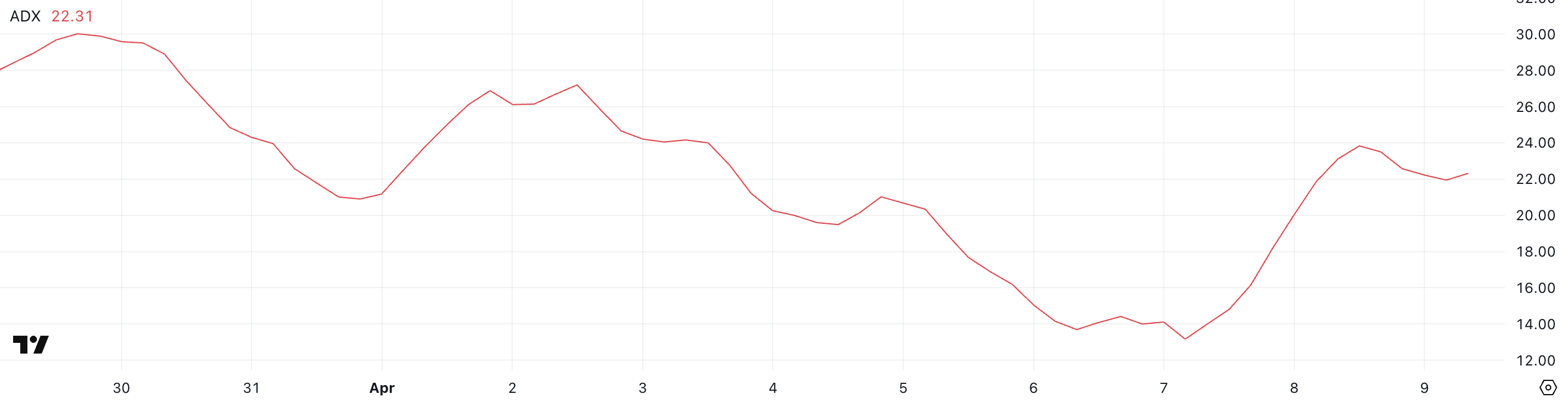 FARTCOINin ADX on tällä hetkellä 22,31, mikä on merkittävä nousu 13,16:sta vain kaksi päivää sitten, vaikka se on hieman alle eilisen huipun 23,83.