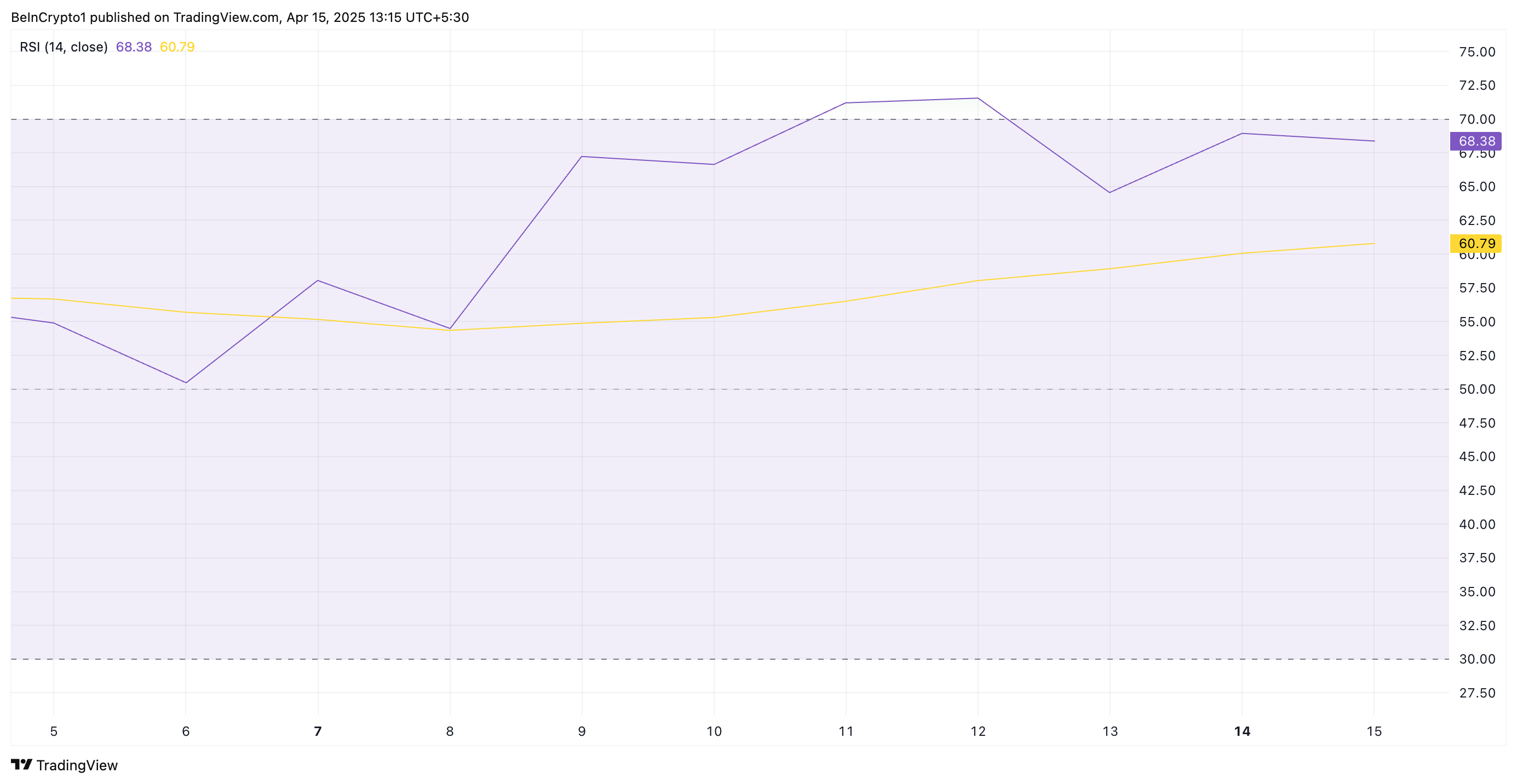 Lisäksi meemikolikon suhteellinen voimaindeksi (RSI) pysyy alle 70, mikä tarkoittaa, että se ei ole vielä saavuttanut yliostettuja olosuhteita, jättäen tilaa lisänousulle. Kirjoitushetkellä tämä indikaattori, joka mittaa omaisuusvaran yli- ja alimyydyt markkinaolosuhteet, on 68,38.
