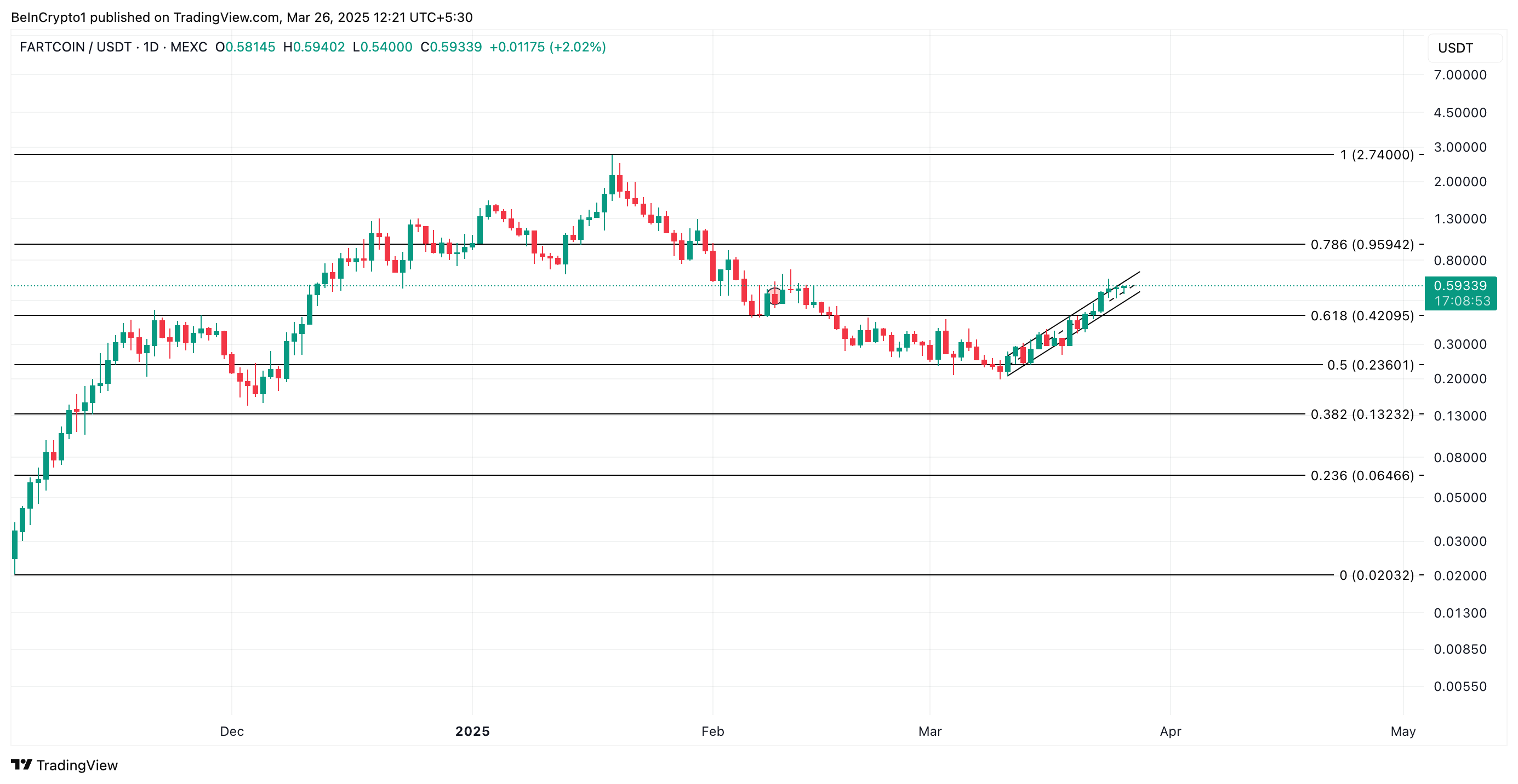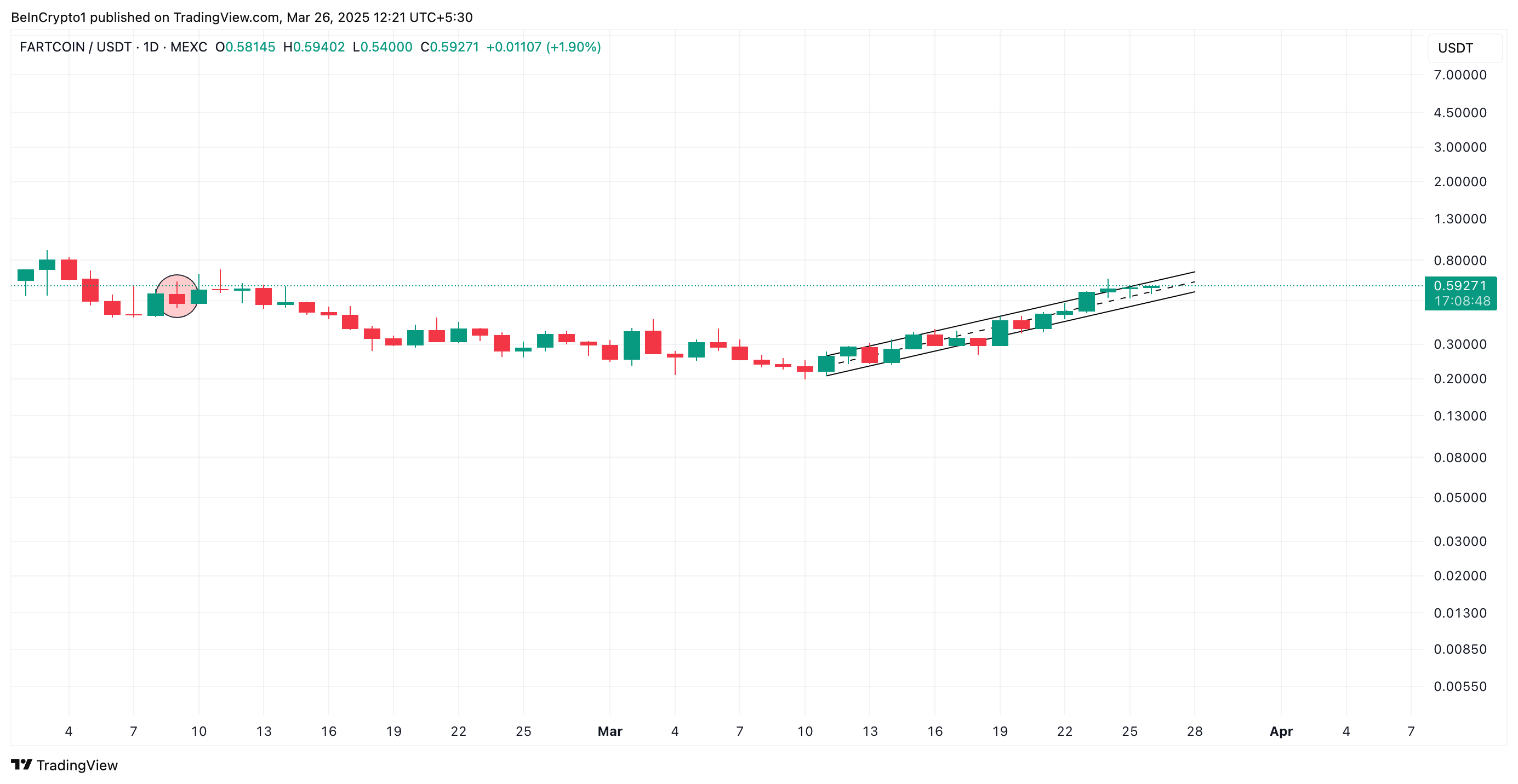 FARTCOIN on säilyttänyt noususuuntauksen sen jälkeen, kun se romahti vuoden alimmalle tasolle 0,19 dollaria 10. maaliskuuta. Tällä hetkellä kaupankäyntihinta on 0,59 dollaria, ja meemikolikon hinta on noussut 200 %, kaupankäynnin jatkuessa nousevassa rinnakkaiskanavassa.