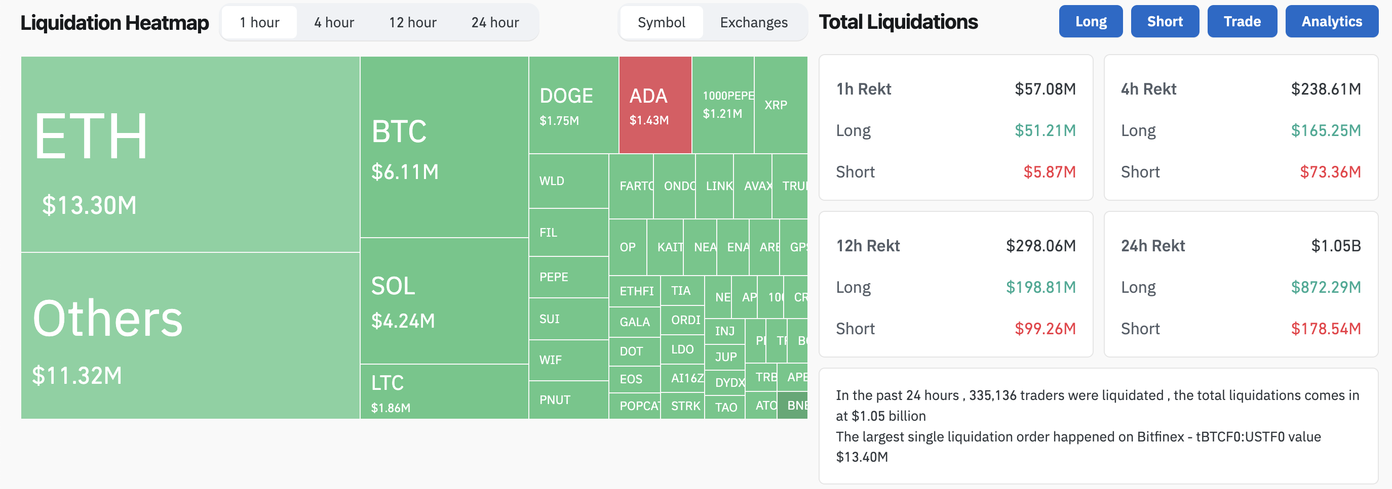 Kryptolikvidoinnit ylittävät 1 miljardin dollaria. Lähde: CoinGlass