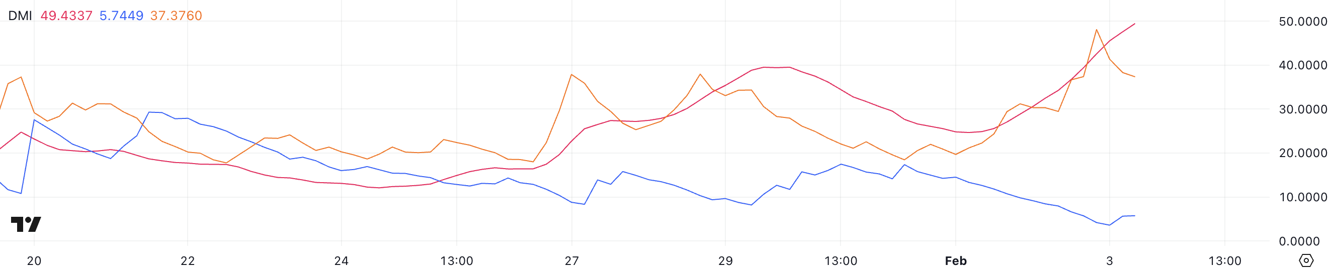FET:n ADX on tällä hetkellä 49,4, lähes kaksinkertaistuen 24,8:sta vain kahdessa päivässä. Tämä jyrkkä nousu osoittaa, että nykyisen trendin voima voimistuu, vahvistaen markkinoiden suuntaa.