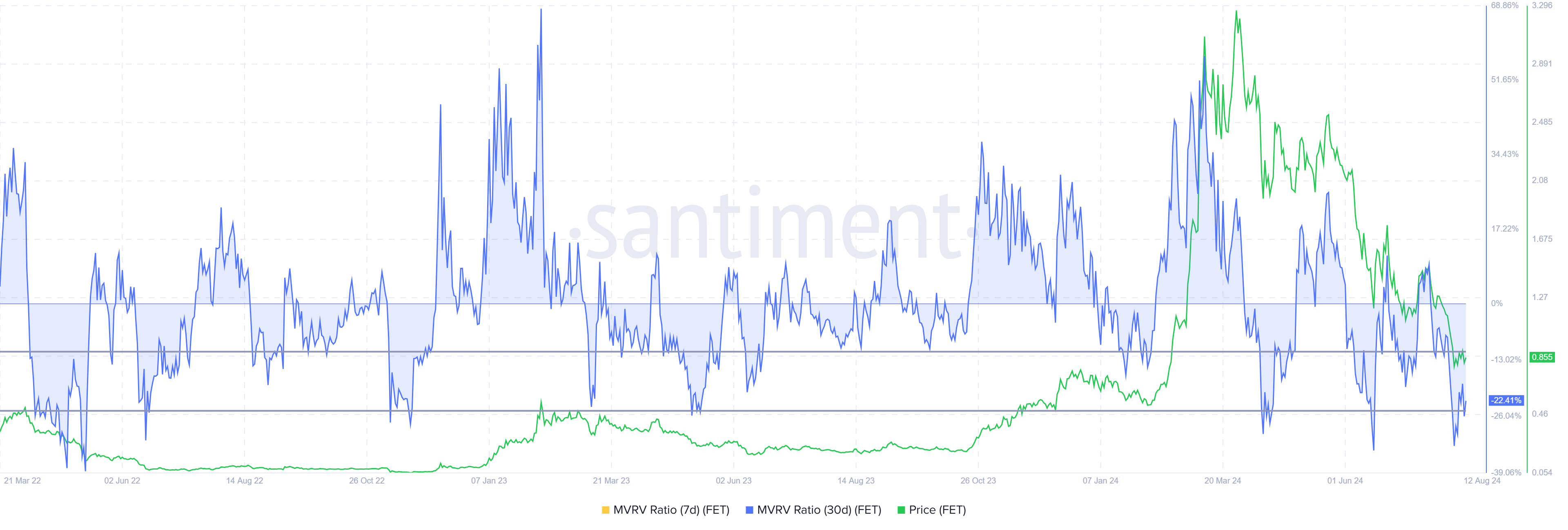 Tällä hetkellä altcoinin 30 päivän MVRV on -22 %, mikä viestii tappioista ja potentiaalisesta ostopaineesta. Historiallisesti FET:n MVRV, joka on -11 % ja -24 % välillä, viittaa yleensä hintarallien alkamiseen, merkiten tätä aluetta kumulointimahdollisuutena.