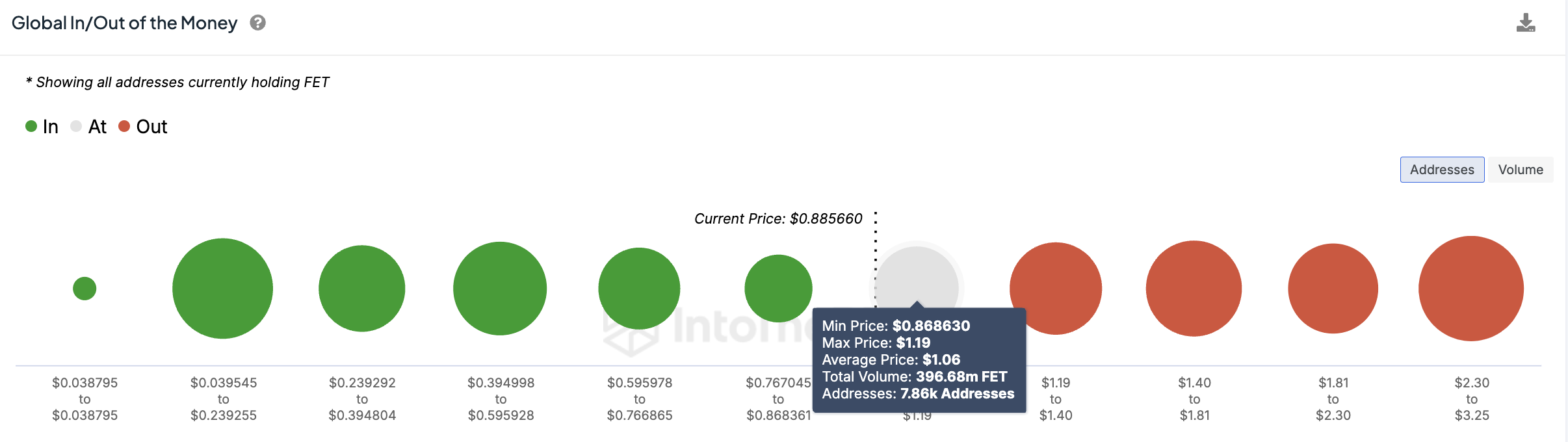 Tämän indikaattorin mukaan noin 396,68 miljoonaa FET:tä, joiden arvo on hieman alle 350 miljoonaa dollaria, saattaa pian nähdä voittoja. Tarjonta, joka on ostettu 0,86 ja 1,19 dollarin välillä, muuttuisi täysin kannattavaksi, kun FET:n hinta saavuttaa 1,20 dollaria.