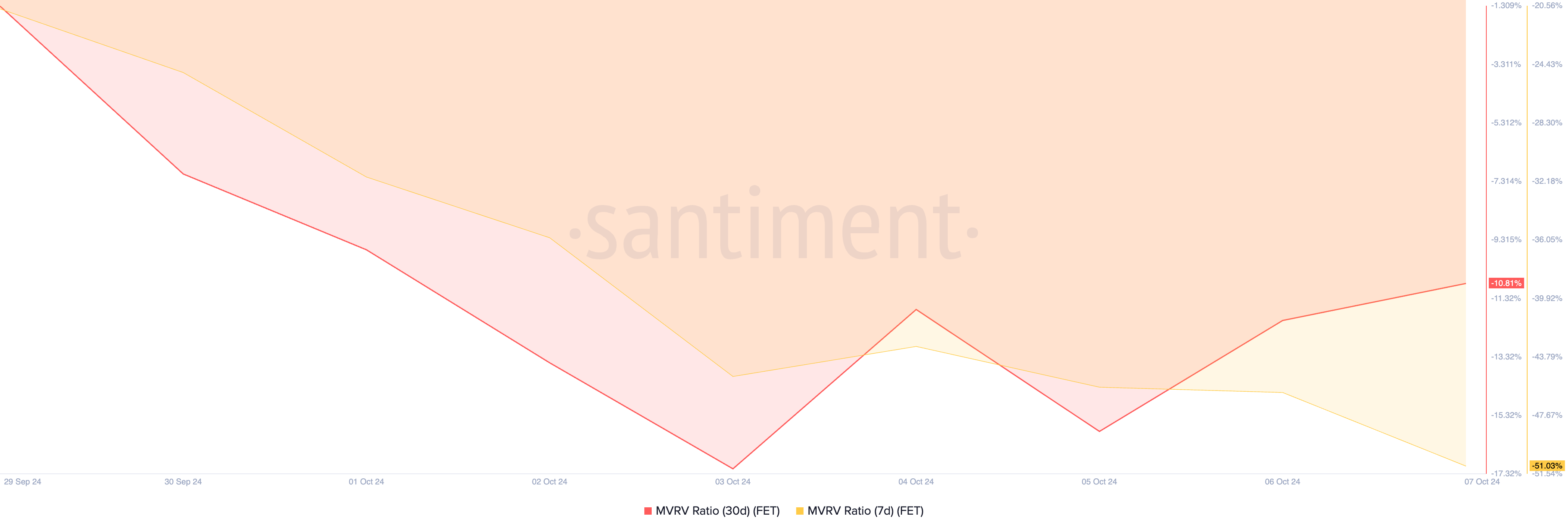 Arvio FET:n markkina-arvon ja toteutuneen arvon (MVRV) suhteesta, joka mittaa kaikkien sen omistajien kokonaistuottoa, osoittaa, että se on kääntynyt negatiiviseksi. Tätä kirjoitettaessa tokenin 7 päivän ja 30 päivän MVRV-suhteet ovat -51,03 ja -10,81.