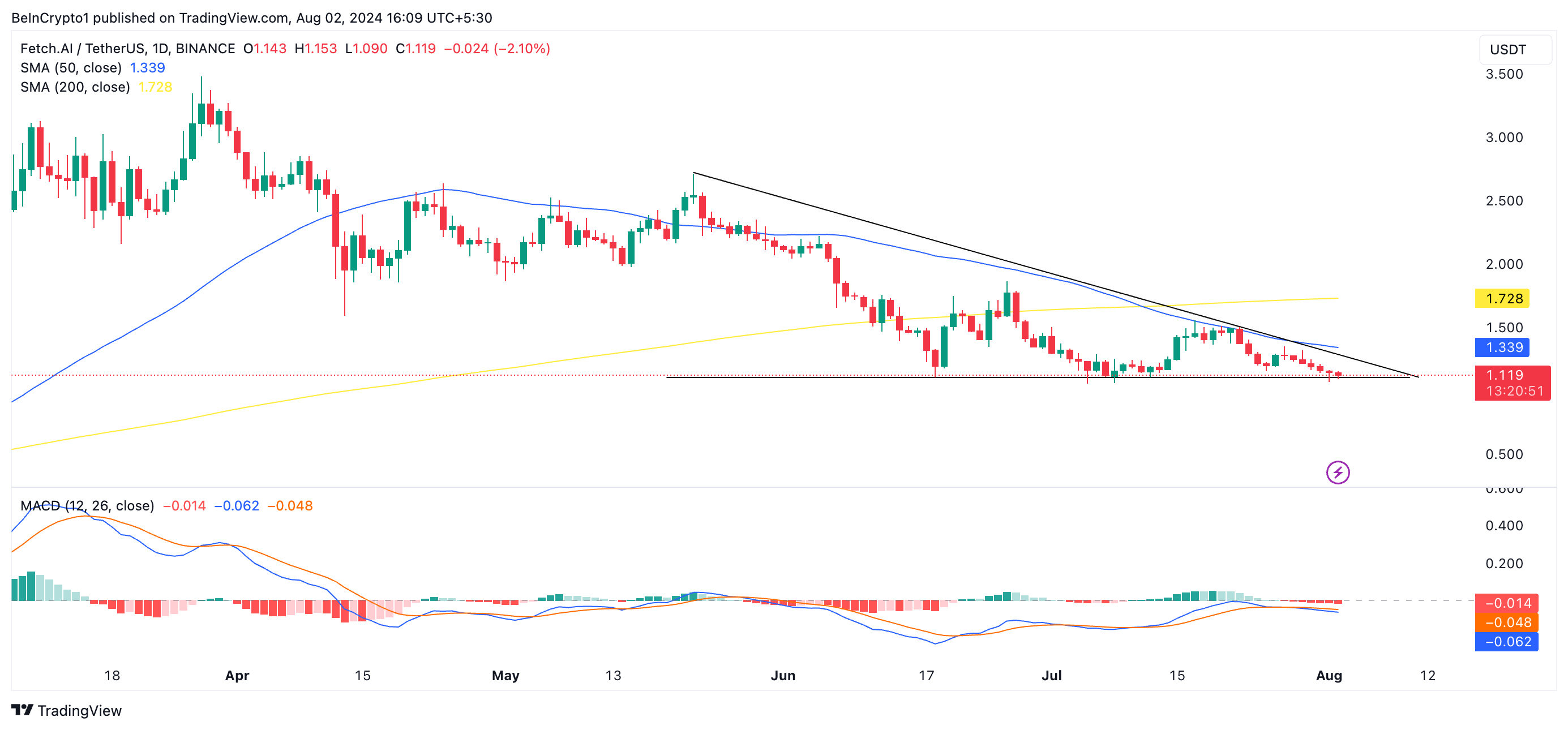 Keinoälyallianssi (FET) on jatkuvasti laskenut toukokuusta lähtien. Sen hinta, joka on arvioitu yhden päivän kaaviossa, on muodostanut laskevan kolmion kuvion.