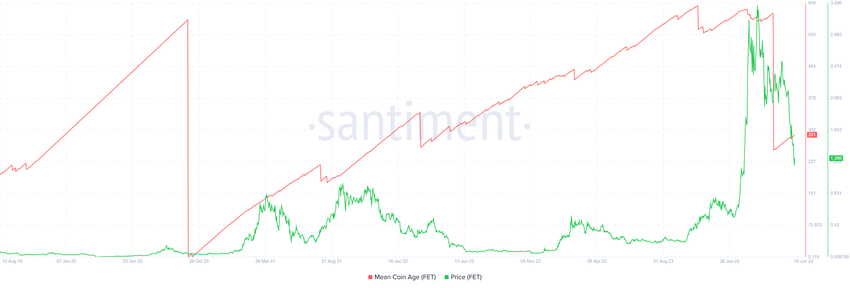 Äskettäisen laskun jälkeen, joka laski FET : n 2.2 dollarista 1.2 dollariin, tuomio sai osuman. Keskimääräinen kolikoiden ikä merkitsi jyrkkää pudotusta, joka on nyt kääntymässä nousuksi. Edellinen on osoitus tunnuksen liikkumisesta osoitteiden välillä, kun taas jälkimmäinen viittaa HODLingiin.