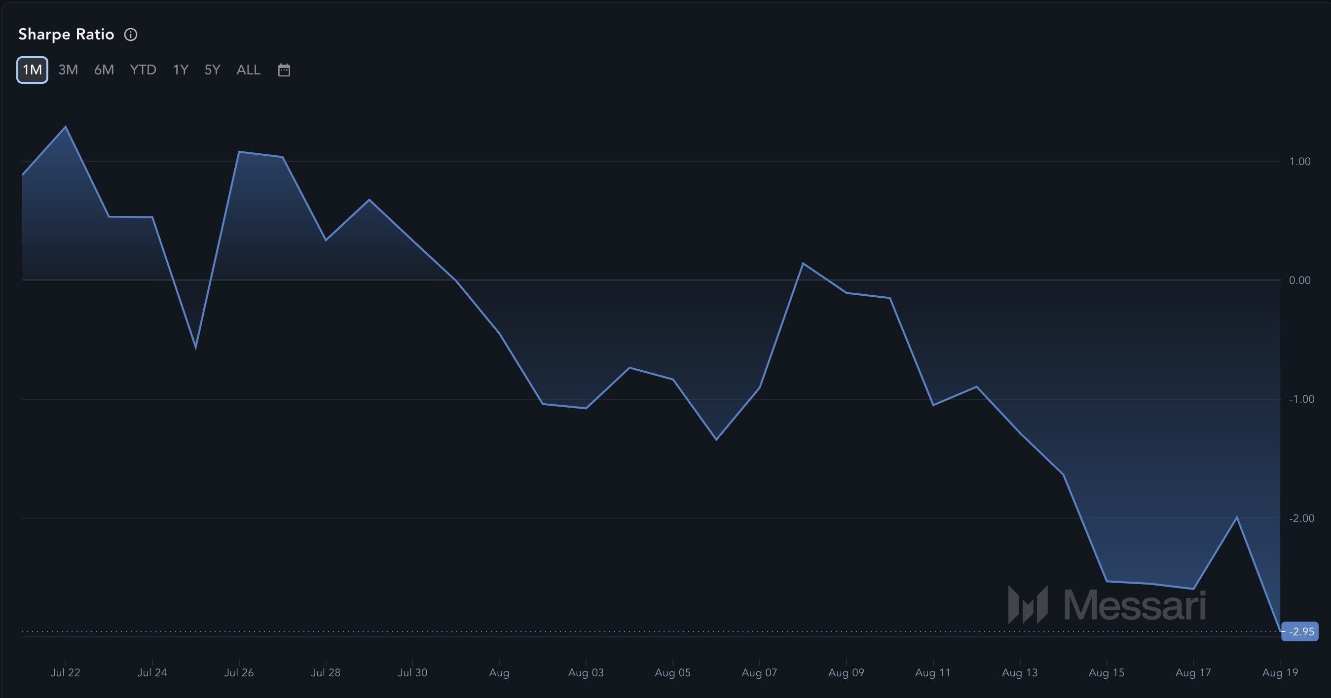 Tämä suhde mittaa riskiin suhteutettuja tuottoja kryptovaluutalle. Yksinkertaisesti sanottuna positiivinen suhde tarkoittaa, että sijoittajilla on hyvät mahdollisuudet saada korkeampi tuotto rahalle, jonka he sijoittavat omaisuusvaraan.
