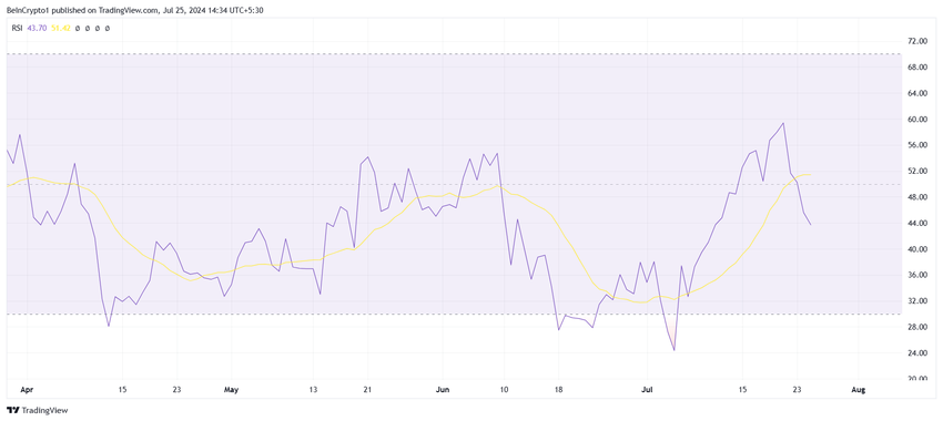 Filecoinin hinta kärsii skeptisyydestä, sillä altcoin jatkaa laskuaan päivittäisessä kaaviossa. Suhteellinen voimaindeksi (RSI) vahvistaa tämän tunnelman.