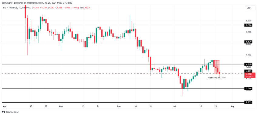 Filecoinin hinta on laskenut 12% viimeisen neljän päivän aikana, vaikka se ylitti aiemmin tällä viikolla 4,6 dollarin kriittisen esteen. Tällä hetkellä kaupankäynti tapahtuu 4,1 dollarissa, ja altcoin on 4,2 dollarin tuen alapuolella, lähestyen 4,0 dollaria.