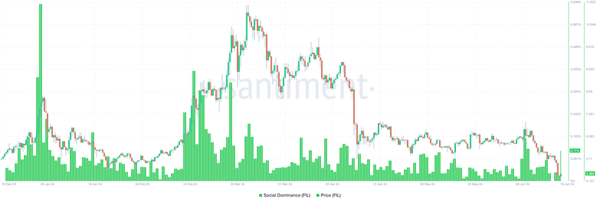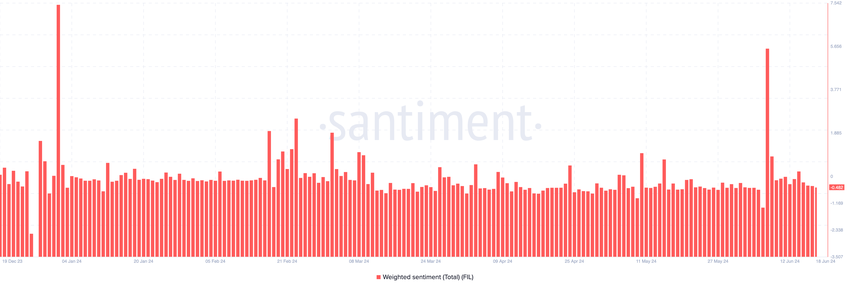 7. kesäkuuta Filecoinin painotettu tunnelma hyppäsi 5,54:ään. Tuona aikana hinta kävi 6,13 dollarissa. Viime päivinä lukema on kuitenkin laskenut. Lehdistöhetkellä sentimenttilukema on -0,48.