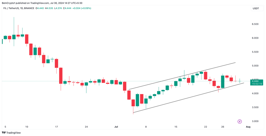 Heinäkuun 23. päivänä FIL ei onnistunut ylittämään kanavan yläreunaa, ja sen hinta on sen jälkeen suuntautunut kohti tukea. Tätä kirjoitettaessa FIL käy kauppaa lähellä tukilinjaa $4.44 hintaan.
