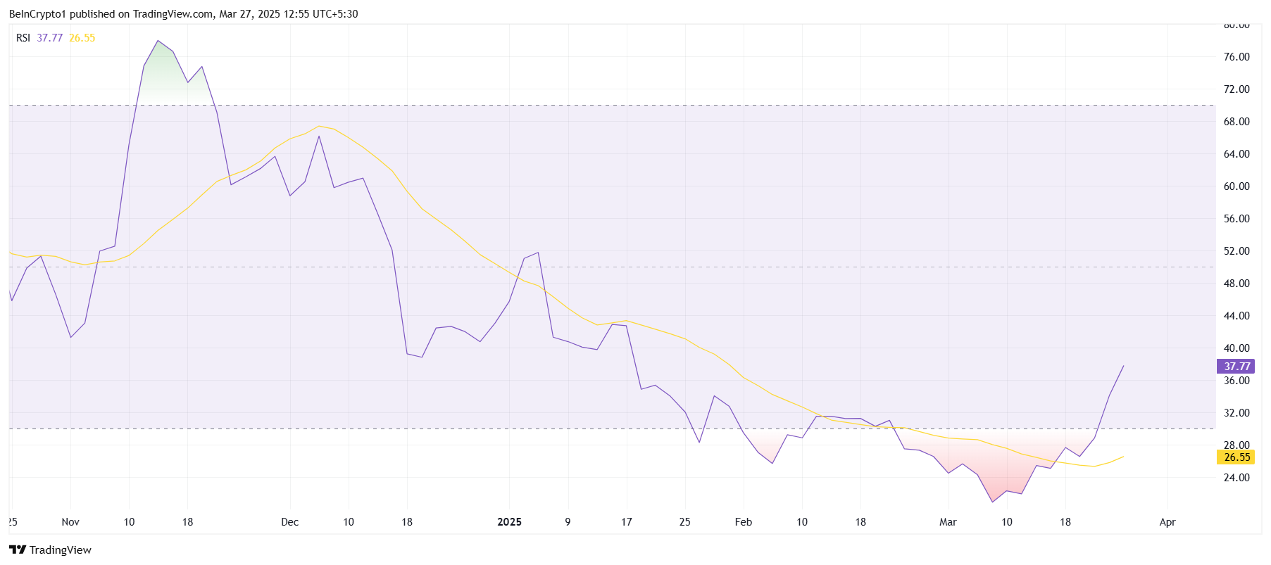 Laajempia markkinaolosuhteita tarkasteltaessa FLOKI:n Relative Strength Index (RSI) on yhä alle neutraalin 50,0 tason, mikä osoittaa, että tunnelma ei ole vahva. Vaikka RSI on hieman toipunut ylimyydystä tilasta, se pysyy karhumarkkina-alueella. Tämä viittaa siihen, että markkinat eivät vielä osoita selkeitä merkkejä nousutrendin kääntymisestä, jättäen FLOKI:n alttiiksi lisälaskuille.