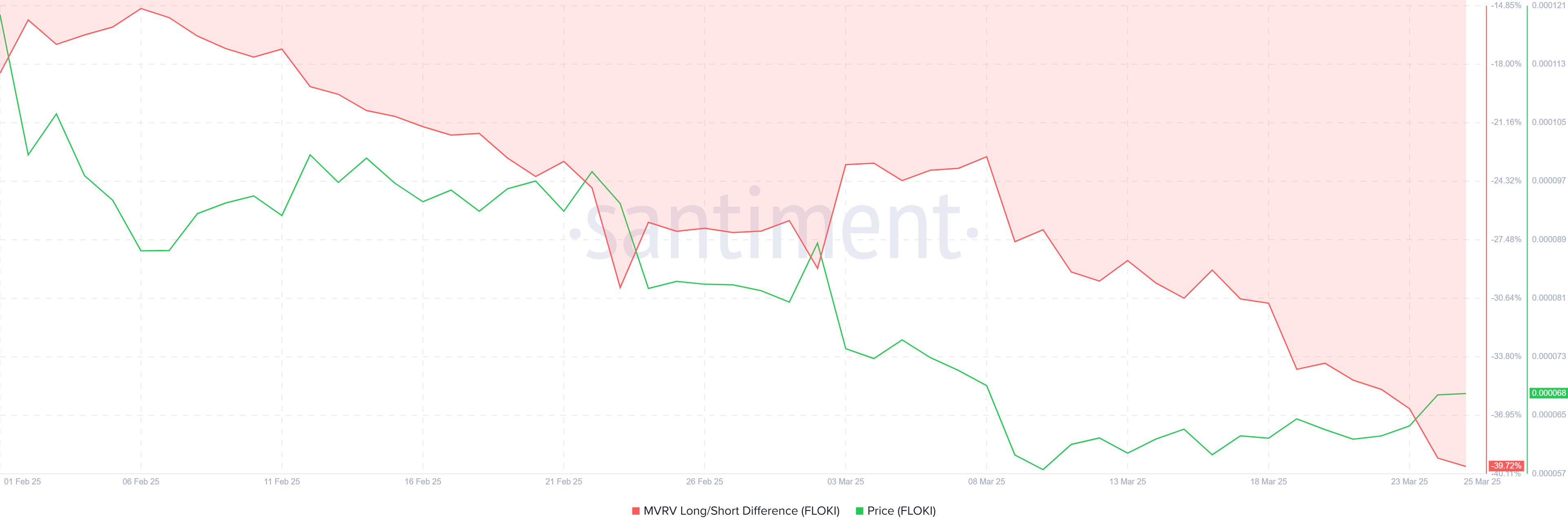 FLOKI:n MVRV Long/Short Difference on tällä hetkellä syvästi negatiivinen -40 %, mikä osoittaa, että lyhytaikaiset haltijat ovat tällä hetkellä voitolla. Tämä on huolestuttava merkki FLOKI:n hinnalle, sillä STH:t ovat yleensä alttiimpia myymään ensimmäisten voittojen merkkien kohdalla. Jos nämä haltijat päättävät likvidoida, FLOKI saattaa kohdata merkittävää laskupainetta.