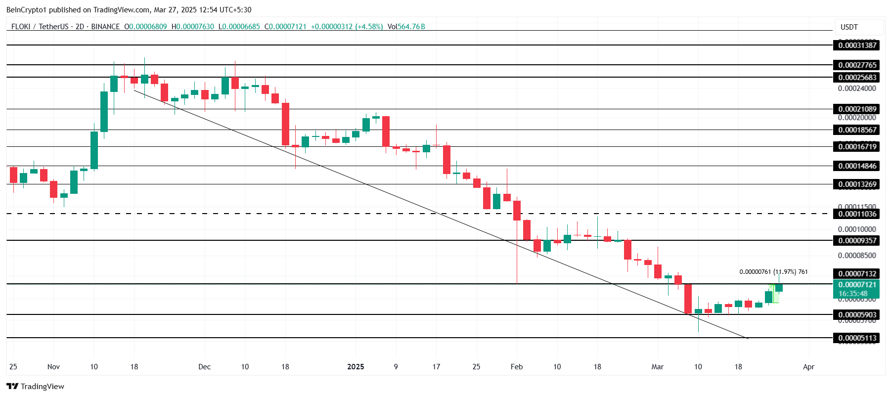 Tällä hetkellä FLOKI:n hinta on 0,00007121 dollaria, ja se on noussut 12 % viimeisen 24 tunnin aikana. Meemikolikko yrittää kääntää 0,00007132 dollarin vastustason tueksi. Tämä taso on kuitenkin ollut vaikea murtaa, ja on epävarmaa, pystyykö FLOKI ylläpitämään tätä suuntausta.