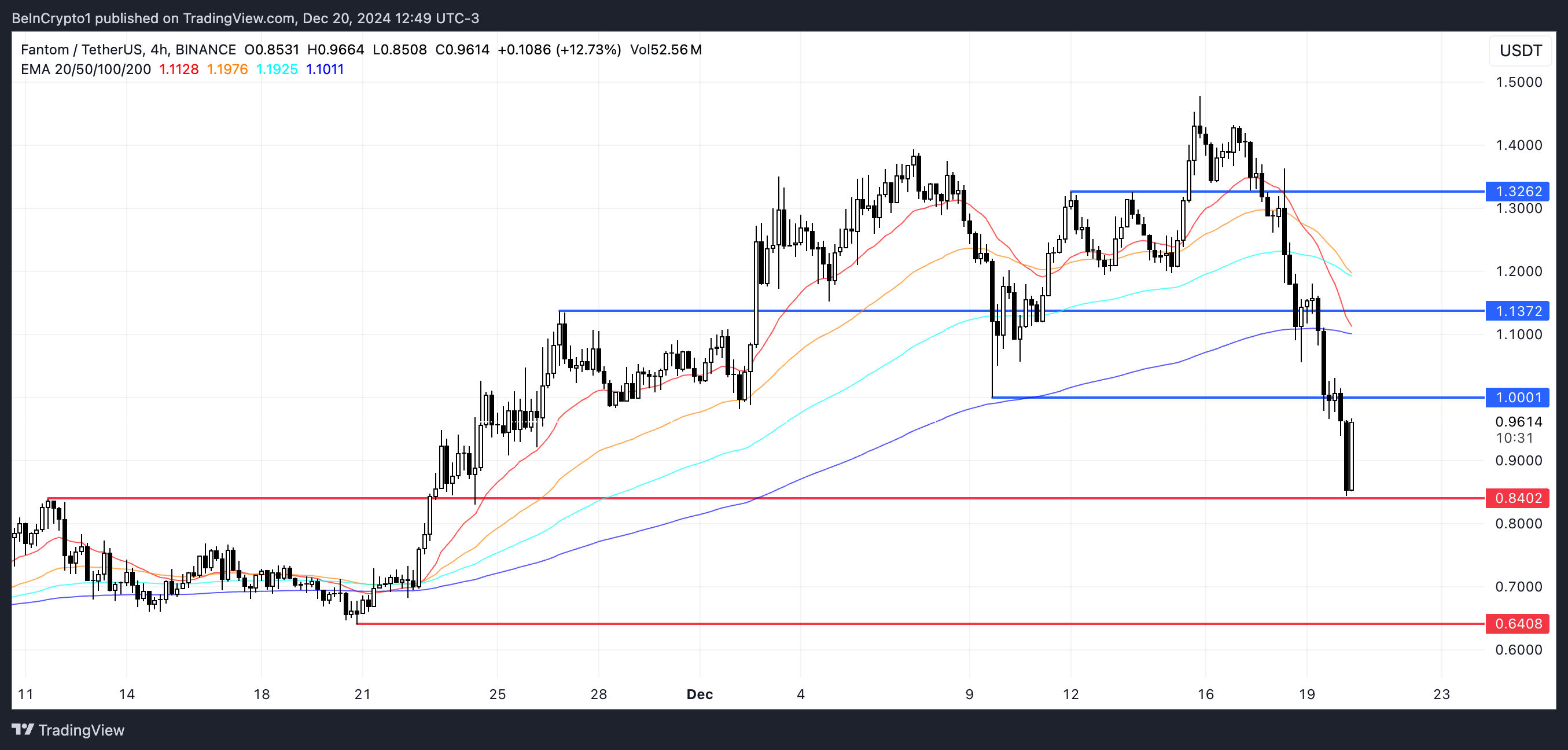 Fantom käy tällä hetkellä kauppaa alueella, jonka tukitaso on noin 0,84 dollaria ja vastustaso 1 dollari.