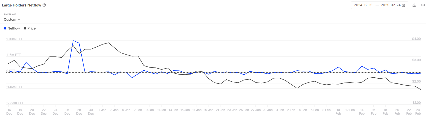 Laajemmassa mittakaavassa FTT:n markkinatunnelma on ollut vaisu. Valaiden osoitteet, joita yleensä pidetään vahvoina hintatrendien indikaattoreina, ovat osoittaneet vähäistä aktiivisuutta viimeisten kahden kuukauden aikana. Suurten lompakonhaltijoiden nettovirrat ovat pysyneet neutraaleina. Tämä osoittaa, että jopa markkinoiden vaikutusvaltaisimmat toimijat ovat osoittaneet vähän kiinnostusta tokeniin.