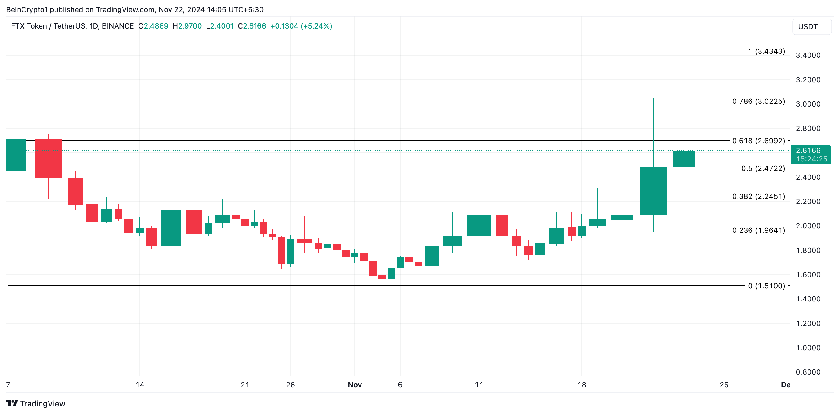 Tätä kirjoitettaessa FTT käy kauppaa 2,61 dollarissa. Jos nousutrendi jatkuu, token ylittää vastustason 2,69 dollarissa, palauttaa 3 dollarin hintamerkin ja nousee kohti vuoden alusta lähtien korkeinta arvoaan 3,43 dollaria.