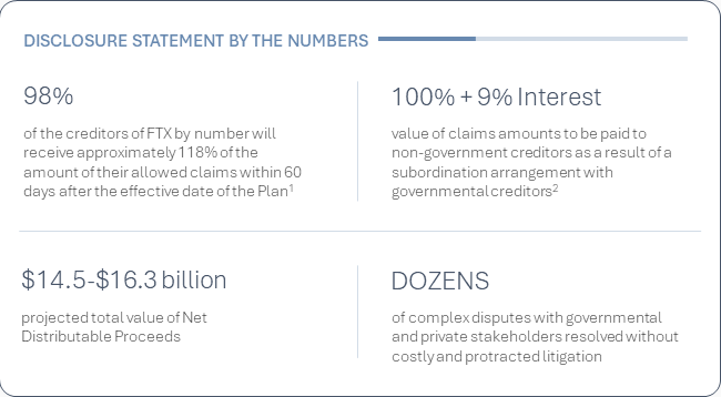 Uudelleenjärjestelystrategia osoittaa, että FTX on varmistanut 14,5–16,3 miljardin dollarin takaisinmaksun. Summa on saavutettu realisoimalla erilaisia omaisuuseriä, mukaan lukien ne, jotka ovat menettelyyn osallistuvien maailmanlaajuisten yhteisöjen määräysvallassa.