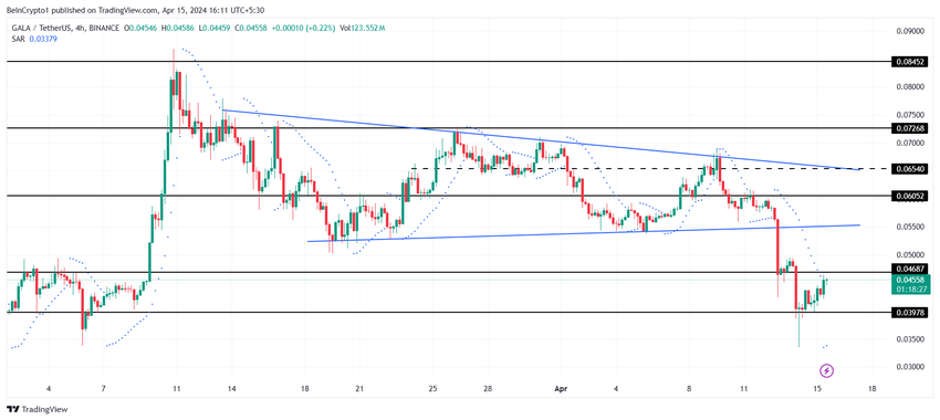 Gala-hinta 0,044 dollarissa on pomppinut 0,039 dollarin tukilattiasta, ja edellä mainittujen ehtojen perusteella se on valmis nousemaan edelleen. Altcoin todennäköisesti jatkaa nousuaan saadakseen takaisin sen laskevan kiilan tuen ja vastuksen, jossa se oli ennen romahdusta.