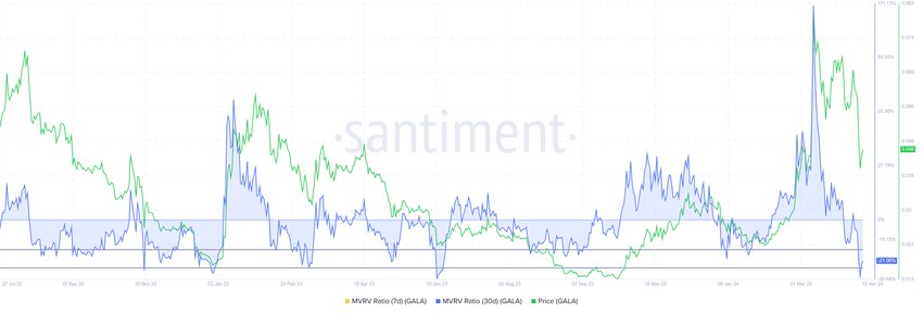 MVRV-suhde mittaa sijoittajien voittoa/tappiota. Galan 30 päivän MVRV -21 %:n kohdalla viestii tappioista, mikä saattaa johtaa kertymiseen. Historiallisesti GALA välillä -14% – -24% MVRV edeltää usein ralleja, kutsuen sitä tilaisuusvyöhykkeeksi kertymiselle.