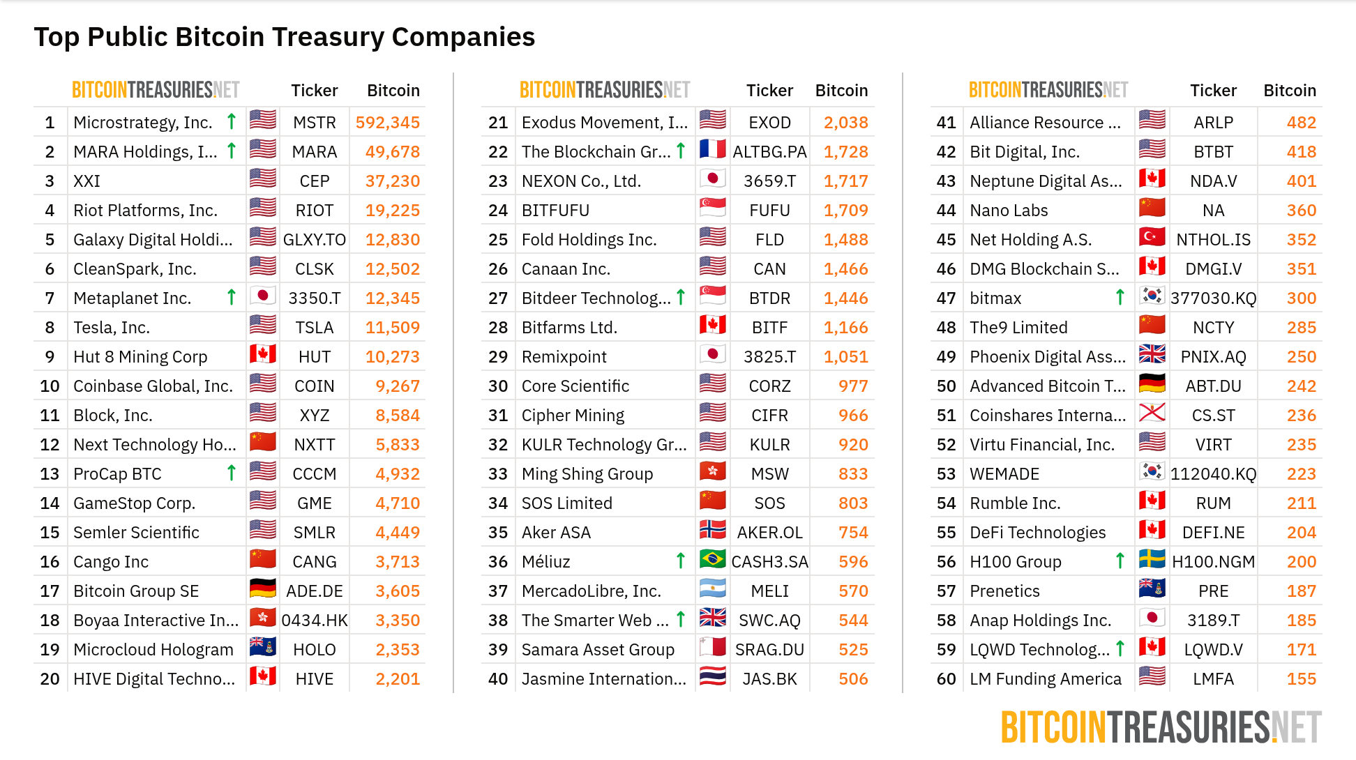 Tällä hetkellä BitcoinTreasuriesin tiedot osoittavat, että GameStopilla on hallussaan noin 4 710 BTC:tä, mikä sijoittaa sen 14. sijalle. Aasian “Strategy”, Metaplanet, on 7. sijalla 12 345 BTC:llä ostettuaan äskettäin lisää 1 234 BTC:tä keskimääräiseen hintaan 107 557 dollaria.
