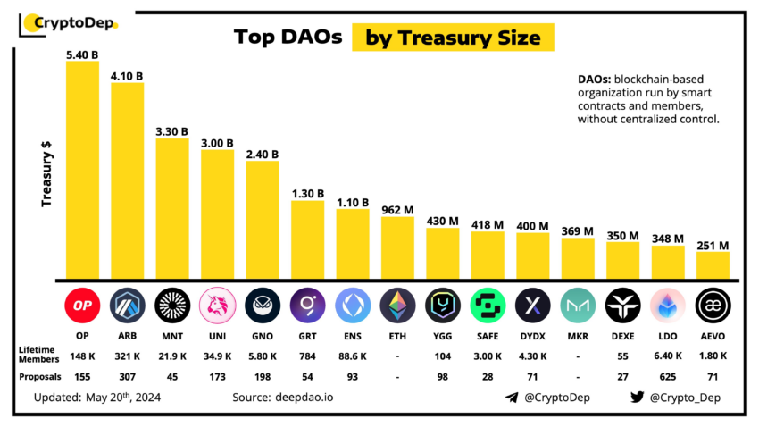 Toukokuun 20. päivästä lähtien noin 50 000 DAO: lla on yhteensä 30 miljardin dollarin omaisuus. Gnosis on 5. suurin DAO kassan koon suhteen, ja sillä on yli 630 miljoonan dollarin omaisuus, toiseksi vain Mantlen jälkeen ei-alkuperäisissä markkinakelpoisissa rahakkeissa.