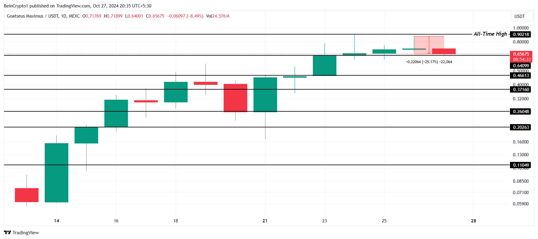 GOAT:in hinta 24% syöksyi eilisen päivän sisäisen huipun jälkeen, jääden vajaaksi pyrkimyksessään vakiinnuttaa uusi kaikkien aikojen korkein taso (ATH). Lasku herättää huolia siitä, voiko meemikolikon nouseva suuntaus jatkua vai seuraako sitä jatkuva arvon aleneminen.