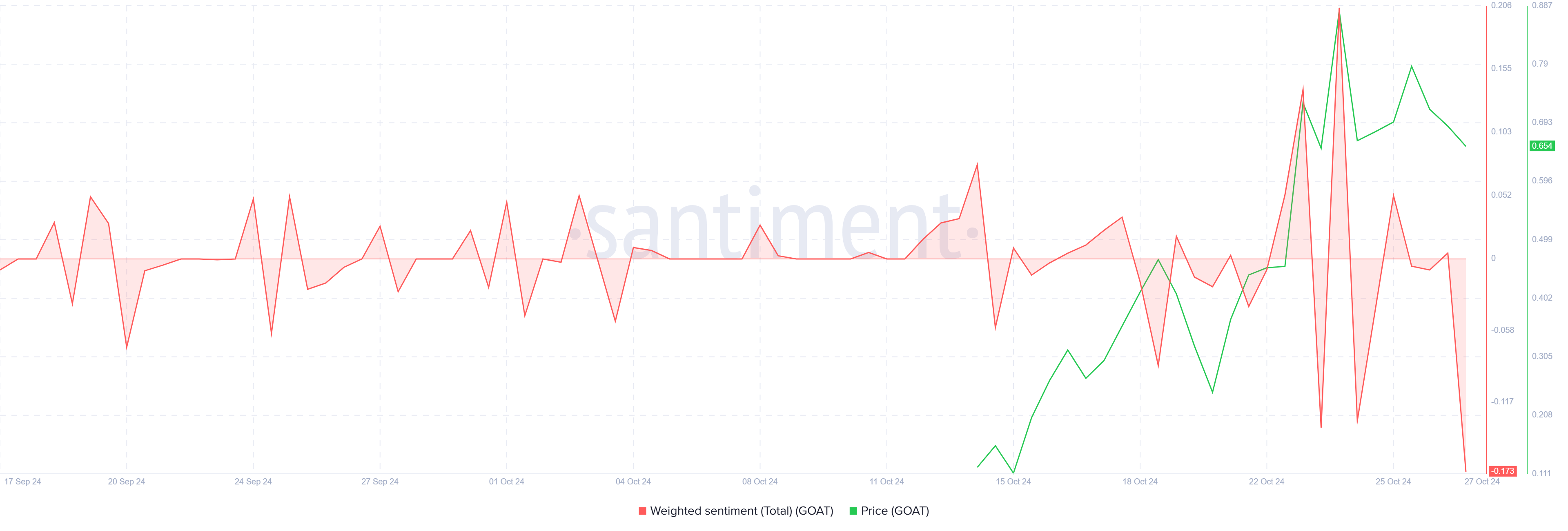 Sijoittajien tunnelma GOATin ympärillä on muuttumassa optimistisuudesta varovaisuuteen. Karhumaisen tunnelman merkkejä on ilmennyt, ja Santimentin tiedot osoittavat piikkejä neutraaliviivan alapuolella, mikä viestii luottamuksen laskusta. Muutos heijastaa epävarmuutta sijoittajien keskuudessa, jotka olivat luottaneet jatkuvaan kasvuun.