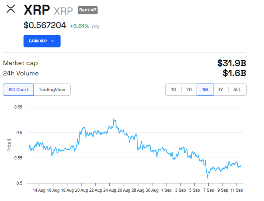 Kuten SUI-token, joka nousi 20 % Grayscale Sui Trustin ilmoituksen jälkeen, XRP on noussut lähes 7 %. Tätä kirjoitettaessa sen hinta on 0,5672 dollaria.