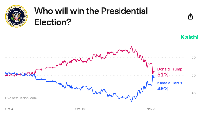 Vastaava liike on havaittavissa Kalshi-nimisellä Yhdysvaltalaisella vedonlyöntialustalla, jossa Harrisin mahdollisuudet ovat nousseet 49%:iin, jääden Trumpista vain kahden prosenttiyksikön päähän.