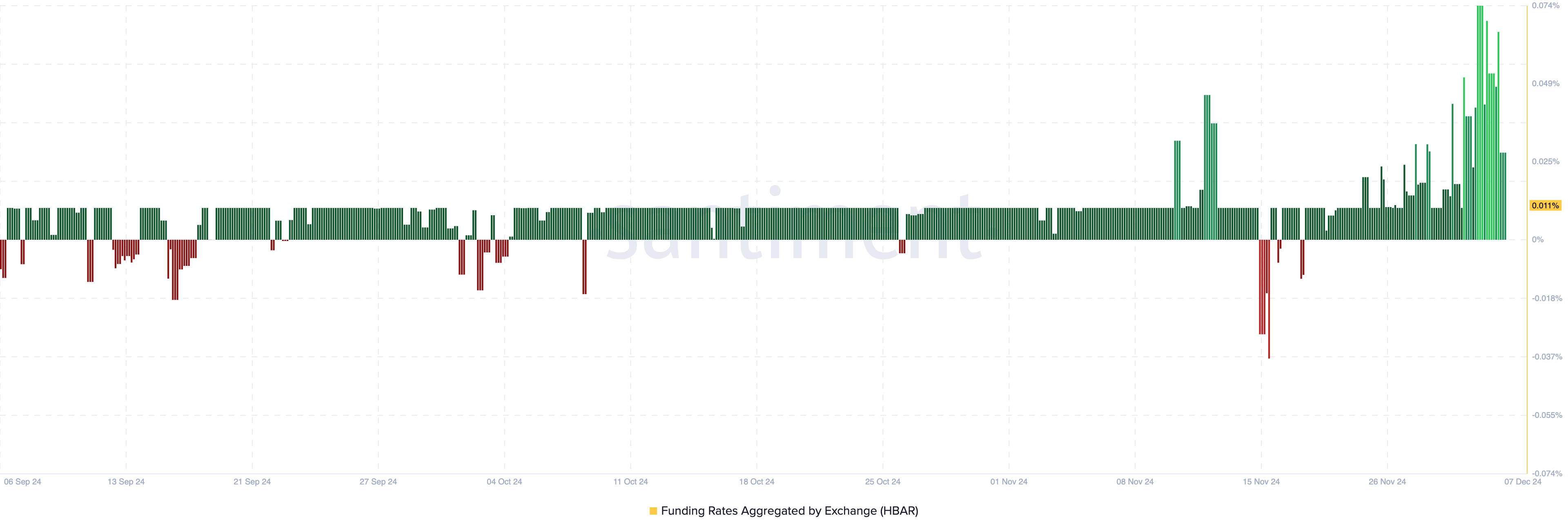 Siksi altcoinin OI:n kasvu viimeaikaisen rallin myötä viittaa siihen, että HBAR:n hinta saattaa pian nousta. Samaan aikaan tokenin rahoitusaste on pysynyt positiivisella alueella.