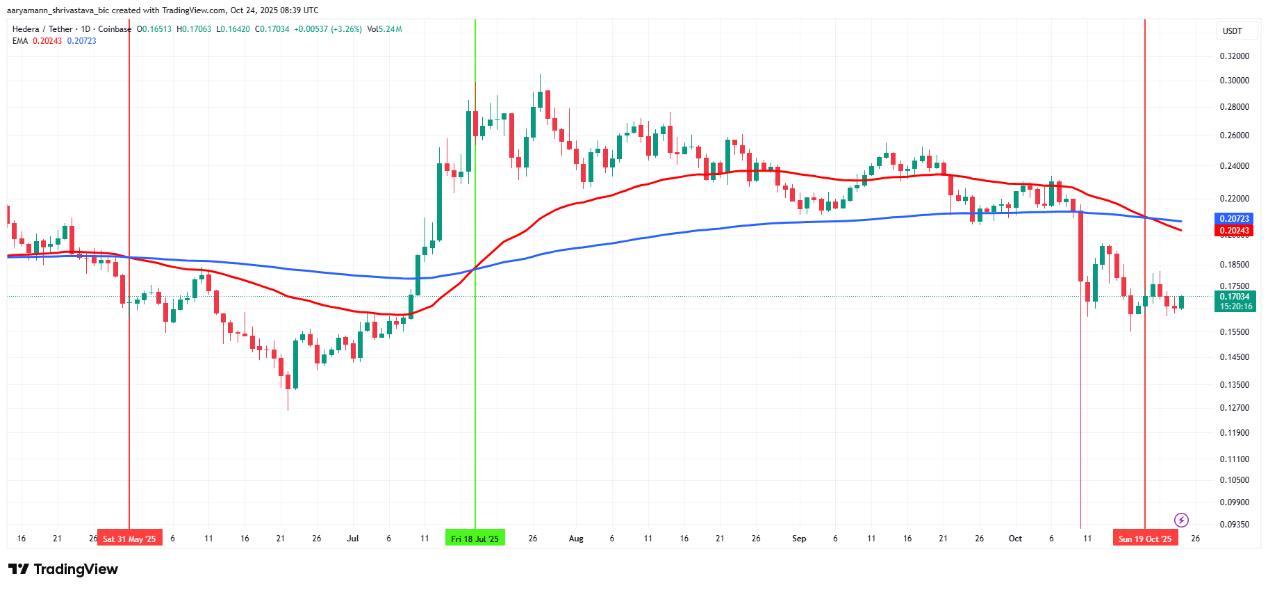 Viimeisin kehitysaskel—Death Cross—viittaa siihen, että HBAR:n nousukausi saattaa olla päättymässä, ainakin lyhyellä aikavälillä.