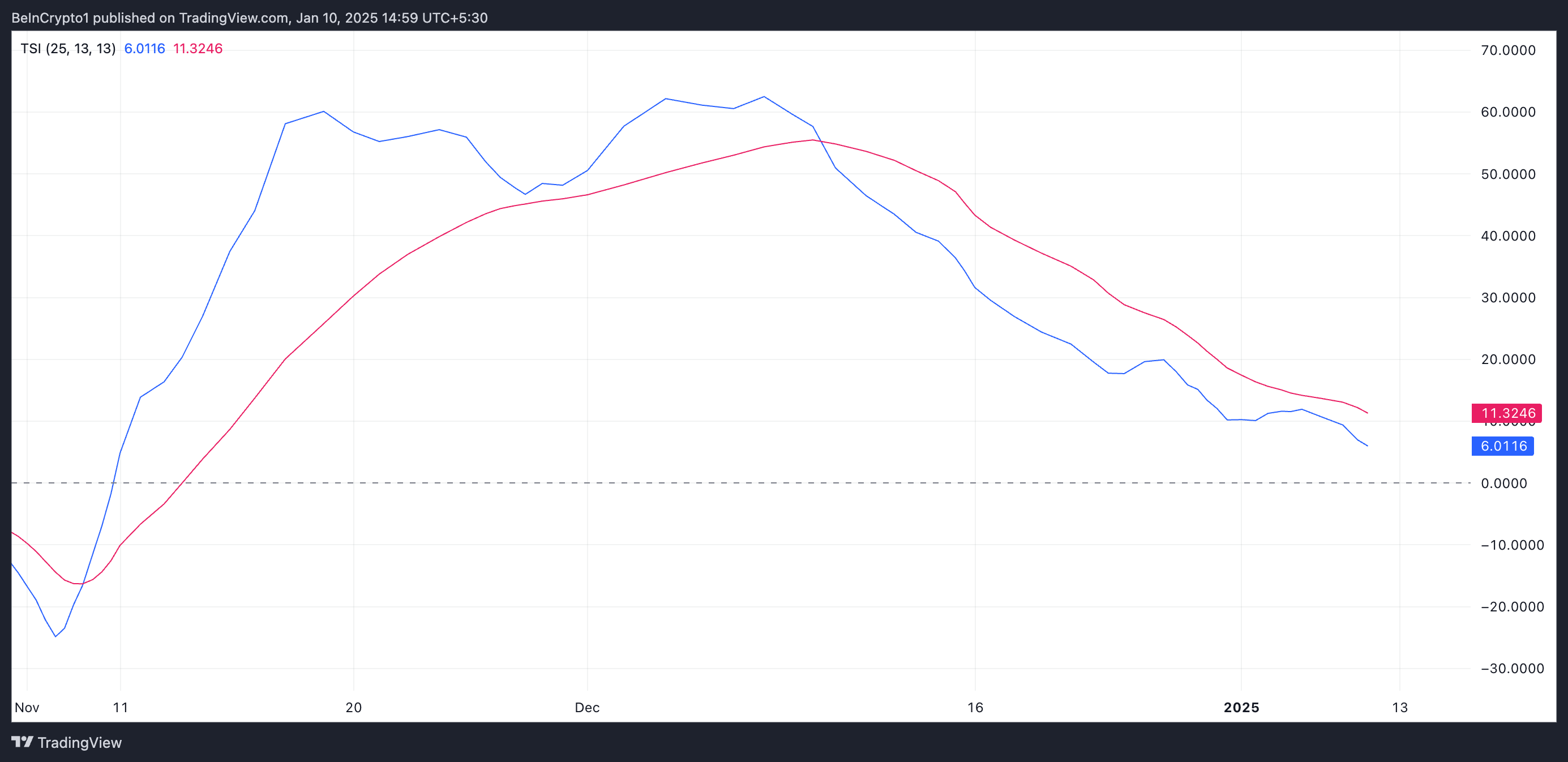 Vaikka HBAR:n spot-sijoitus on positiivinen merkki, sen tekniset indikaattorit viittaavat siihen, että laskupaine jatkuu. Esimerkiksi sen True Strength Index (TSI) -indikaattorin lukemat osoittavat, että TSI-linja (sininen) on signaalilinjan (punainen) alapuolella kirjoitushetkellä, mikä heijastaa vahvistuvaa laskupainetta.