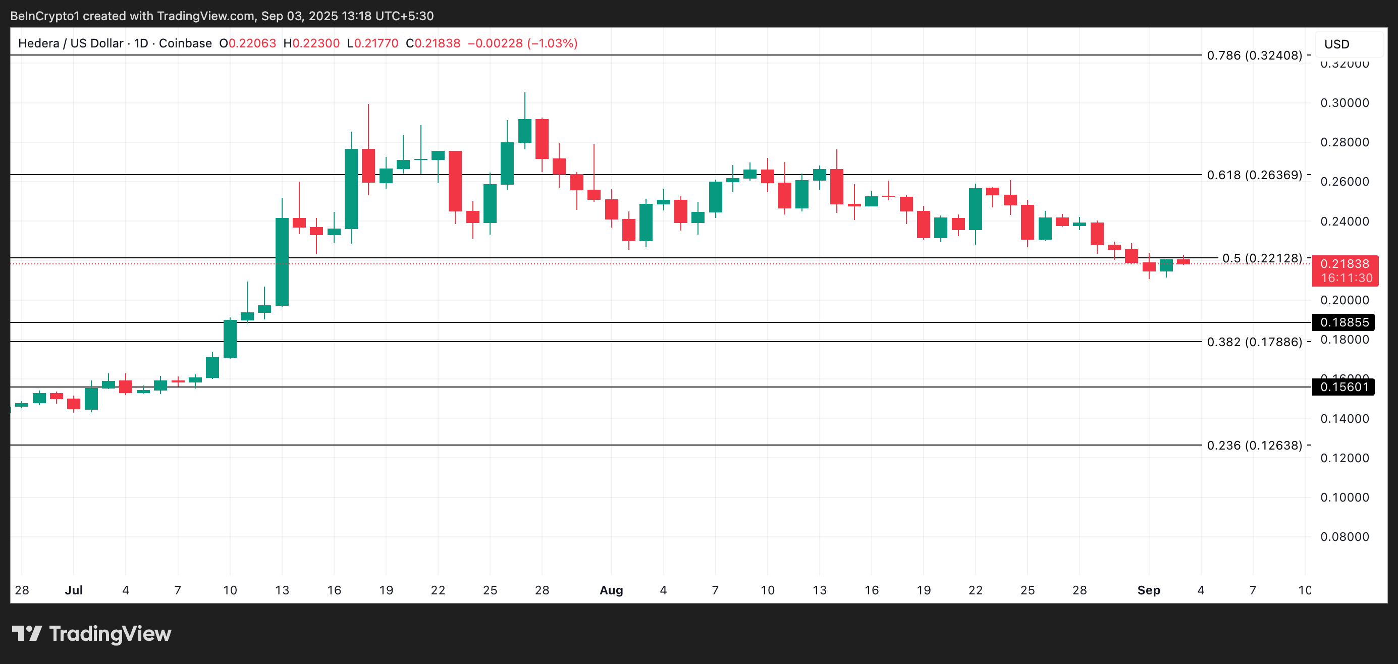 Yllä olevat indikaattorit viittaavat vähentyneeseen sijoittajien kiinnostukseen, heikkenevään sosiaaliseen läsnäoloon ja avainpelaajien tuen vähenemiseen. Jos tämä suuntaus jatkuu, HBAR:n hinta voi jatkaa laskuaan ja pudota 0,1885 dollariin.