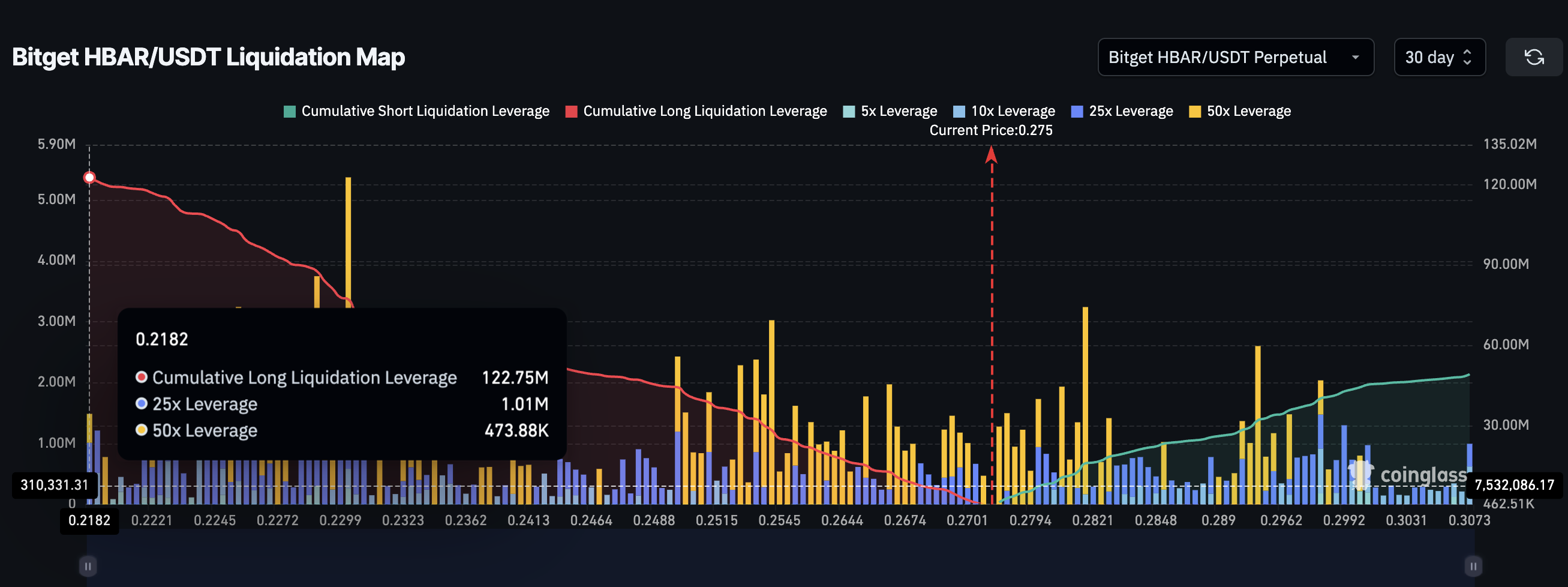 Bitget-likvidointikartta osoittaa, että pitkät vipusuhteet ylittävät huomattavasti lyhyet (122,75 miljoonaa dollaria vs. 49 miljoonaa dollaria), mikä tarkoittaa, että markkinat ovat edelleen noususuuntaisia. Tämä vinouma lisää riskiä: jos hinta laskee, likvidointiklusterit lähellä 0,2182 dollaria voivat kiihdyttää myyntiä.