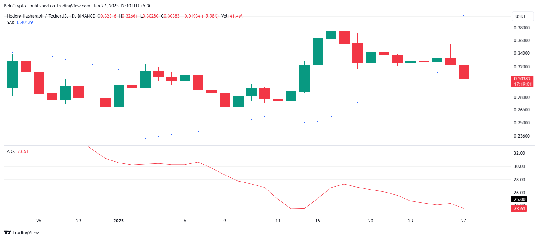 Average Directional Index (ADX) -tunnusluku osoittaa, että HBAR:n noususuuntaus on menettämässä voimaansa, kun indikaattori laskee alle kriittisen 25,0 kynnysarvon. Tämä lasku korostaa meneillään olevan trendin heikkenevää voimaa, joka oli aiemmin ylöspäin. Hiipuva suuntaus heijastaa kasvavaa epävarmuutta sijoittajien keskuudessa altcoinin lähitulevaisuuden näkymistä.