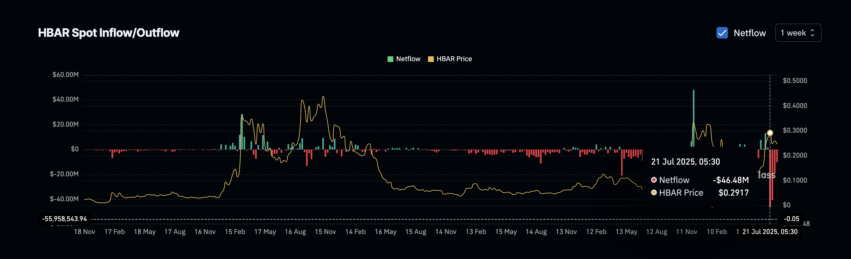 Päivittäinen kaavio tarjoaa oman varoituksensa. HBAR on konsolidoitunut viirin sisällä, joka on kiristyvä alue, jonka muodostavat lähentyvät trendilinjat. Hintakehitys on nyt kiinni alemmassa trendilinjassa, joka sijaitsee juuri avaintuen yläpuolella 0,24 dollarissa.