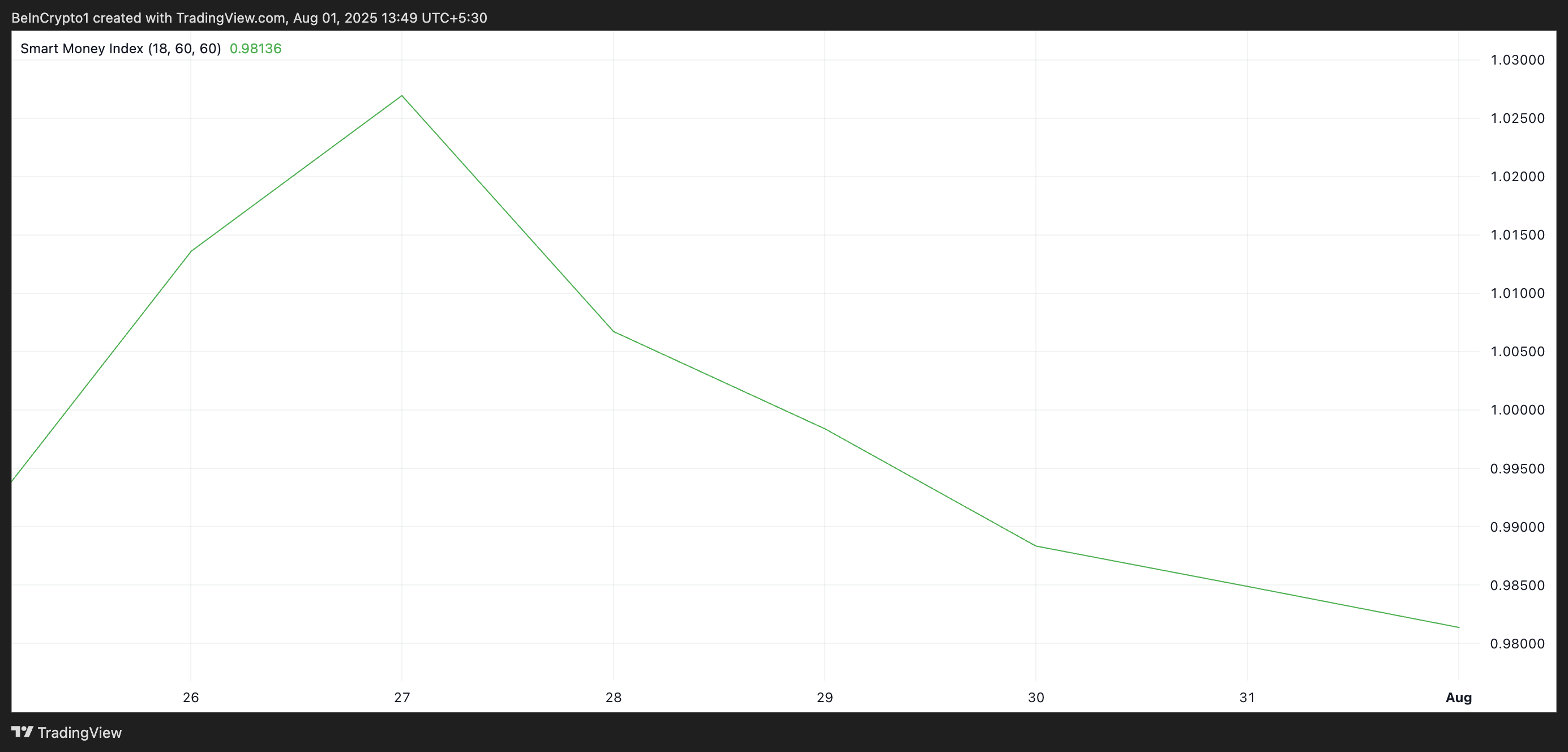 Myyntitoiminta on myös noussut HBAR:n “älykkäiden haltijoiden” keskuudessa. Tokenin Smart Money Index (SMI) -indikaattorin lukemat paljastavat tasaisen laskun kysynnässä näiden sijoittajien keskuudessa sunnuntaista lähtien. Julkaisuhetkellä se on 0,98.