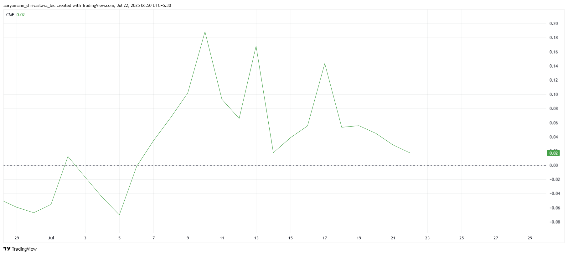 Chaikin Money Flow (CMF), tärkeä tekninen indikaattori, maalaa varovaisemman kuvan. Tällä hetkellä CMF osoittaa makrotason notkahdusta, vaikka se pysyykin neutraalin nollalinjan yläpuolella. Tämä viittaa siihen, että vaikka sijoituksia on, ulosvirtaukset alkavat kasvaa, mikä osoittaa joidenkin sijoittajien poistuvan positioistaan.