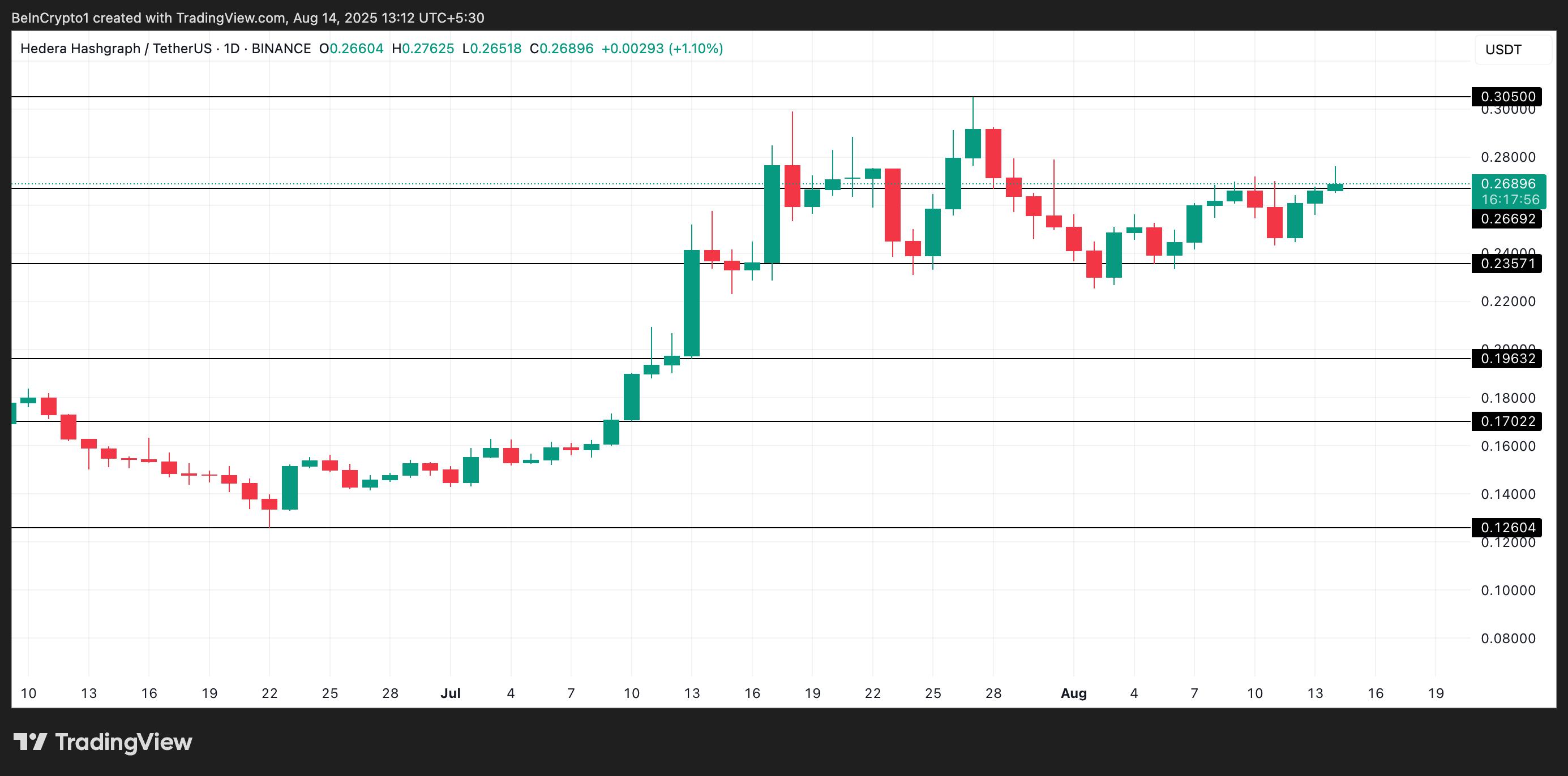 Kuvio syntyy, kun omaisuusvaran hinta vaihtelee määritellyn vastus- ja tukitason välillä, mikä viittaa konsolidoitumiseen. Elokuun 1. päivästä lähtien HBAR on kohdannut vastuksen 0,2669 dollarissa, kun taas tuki on pitänyt 0,2357 dollarissa.