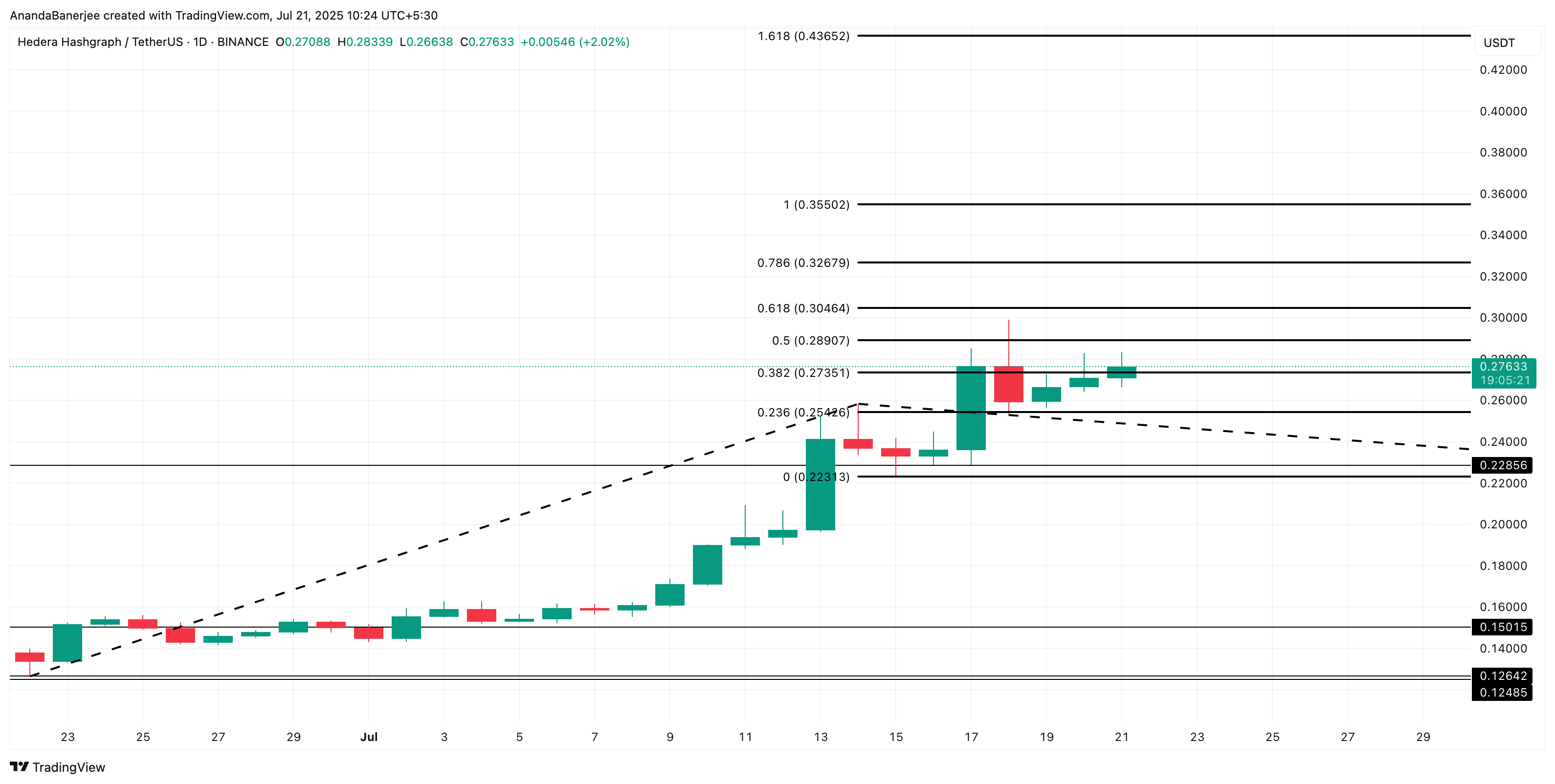 Jos tämä taso pitää, seuraavat vastustasot ovat 0,28 dollaria (0,5 Fib) ja 0,30 dollaria (0,618 Fib), jota seuraa 0,32 dollaria (0,786 Fib) taso. Vahvistettu läpimurto 0,382 ja 0,5 Fib tasoilta voisi avata HBAR-hinnan polun kohti 0,35 dollaria+, mikä vastaa 1,0 Fib laajennusta ja aiempia huippuja.