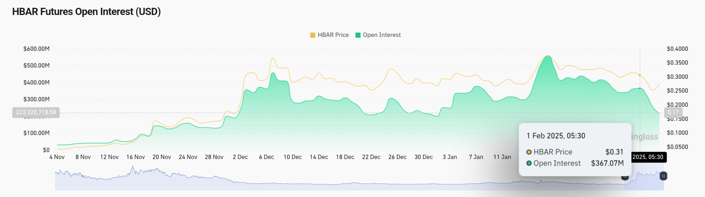 Markkinoiden reaktio HBAR:n viimeaikaiseen laskuun näkyy futuurimarkkinoiden tiedoissa. Open Interest on tällä hetkellä 216 miljoonaa dollaria, mikä on jyrkkä lasku 367 miljoonasta dollarista vain kolme päivää sitten. 150 miljoonan dollarin pudotus korostaa kauppiaiden epäröintiä, ja monet likvidoivat positioitaan.