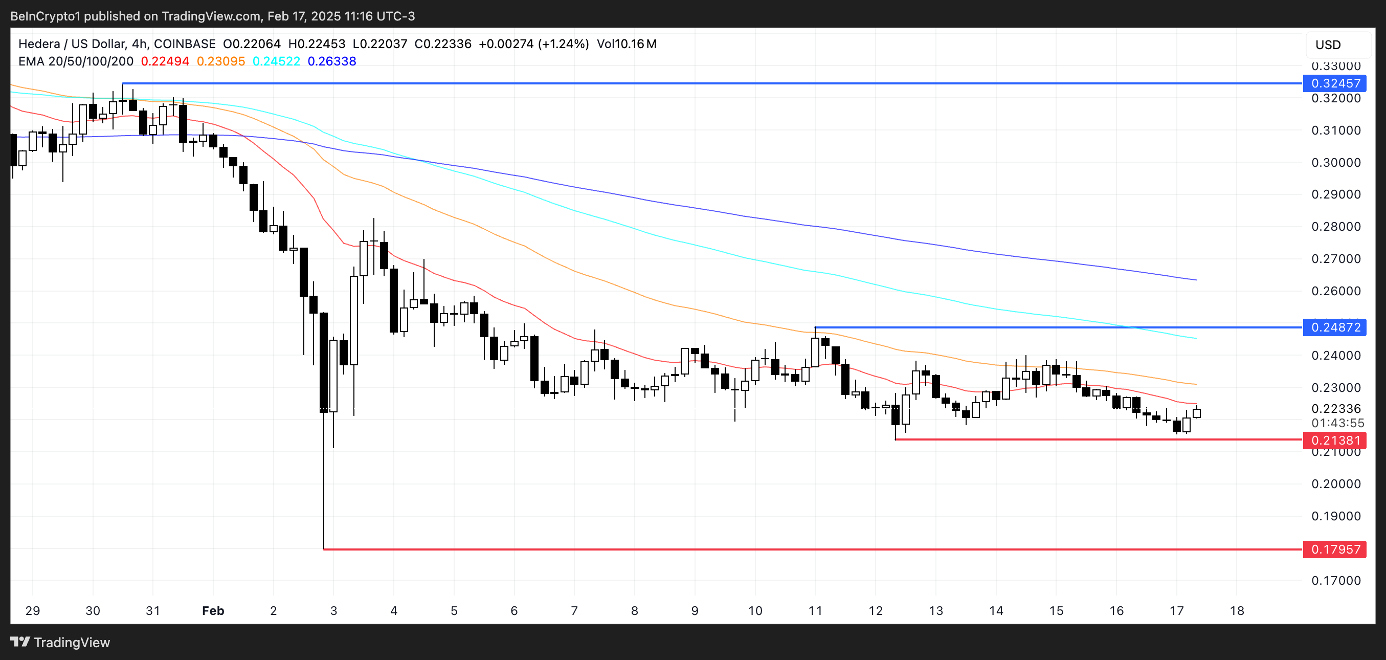Hedera-hintakaavio osoittaa, että sen lyhyen aikavälin EMA-linjat ovat pitkän aikavälin linjojen alapuolella, mikä vahvistaa karhumaista trendiä. Jos laskusuuntaus jatkuu, HBAR voi testata 0,21 dollarin tukitasoa, ja sen menettäminen voi työntää sen edelleen alas 0,179 dollariin.